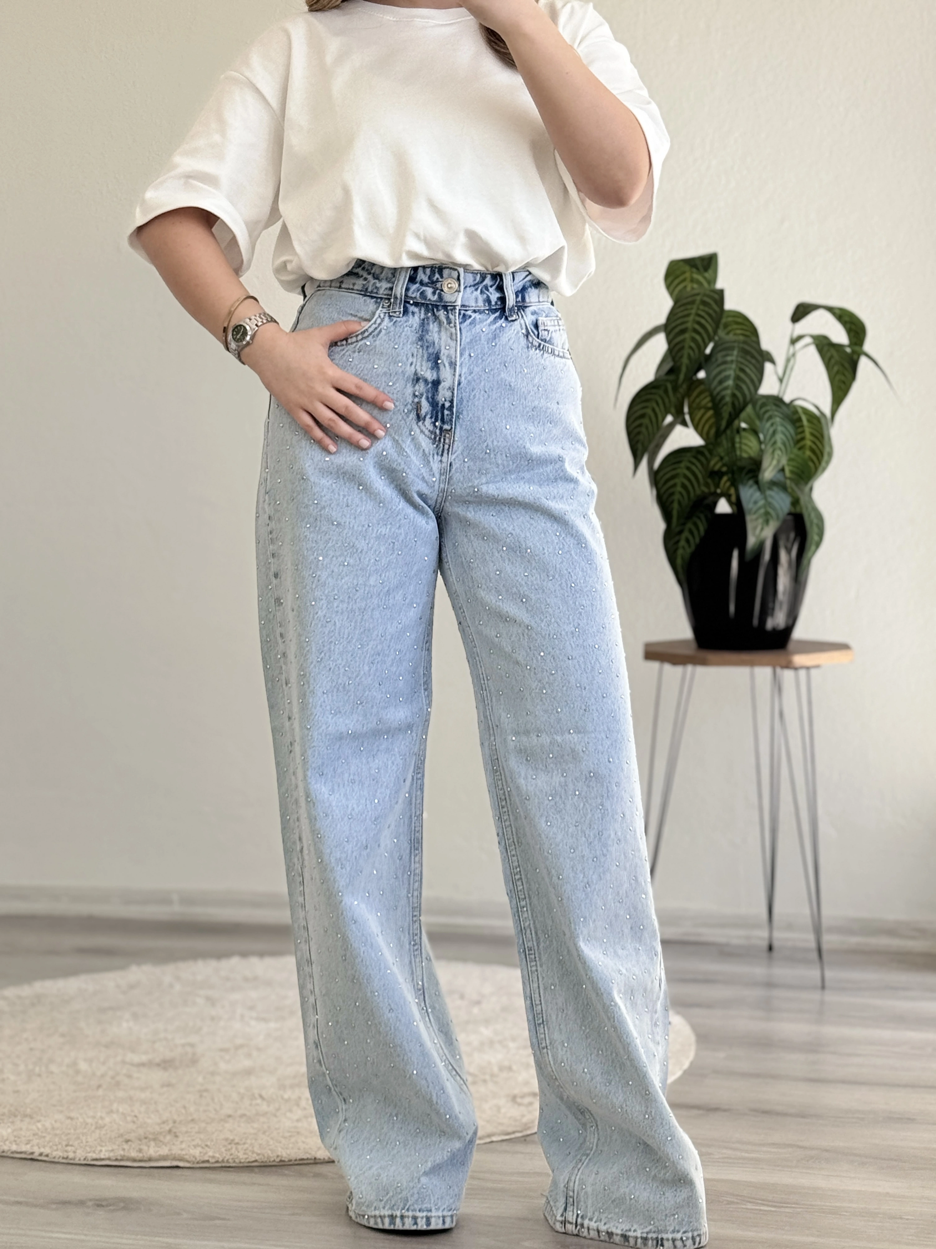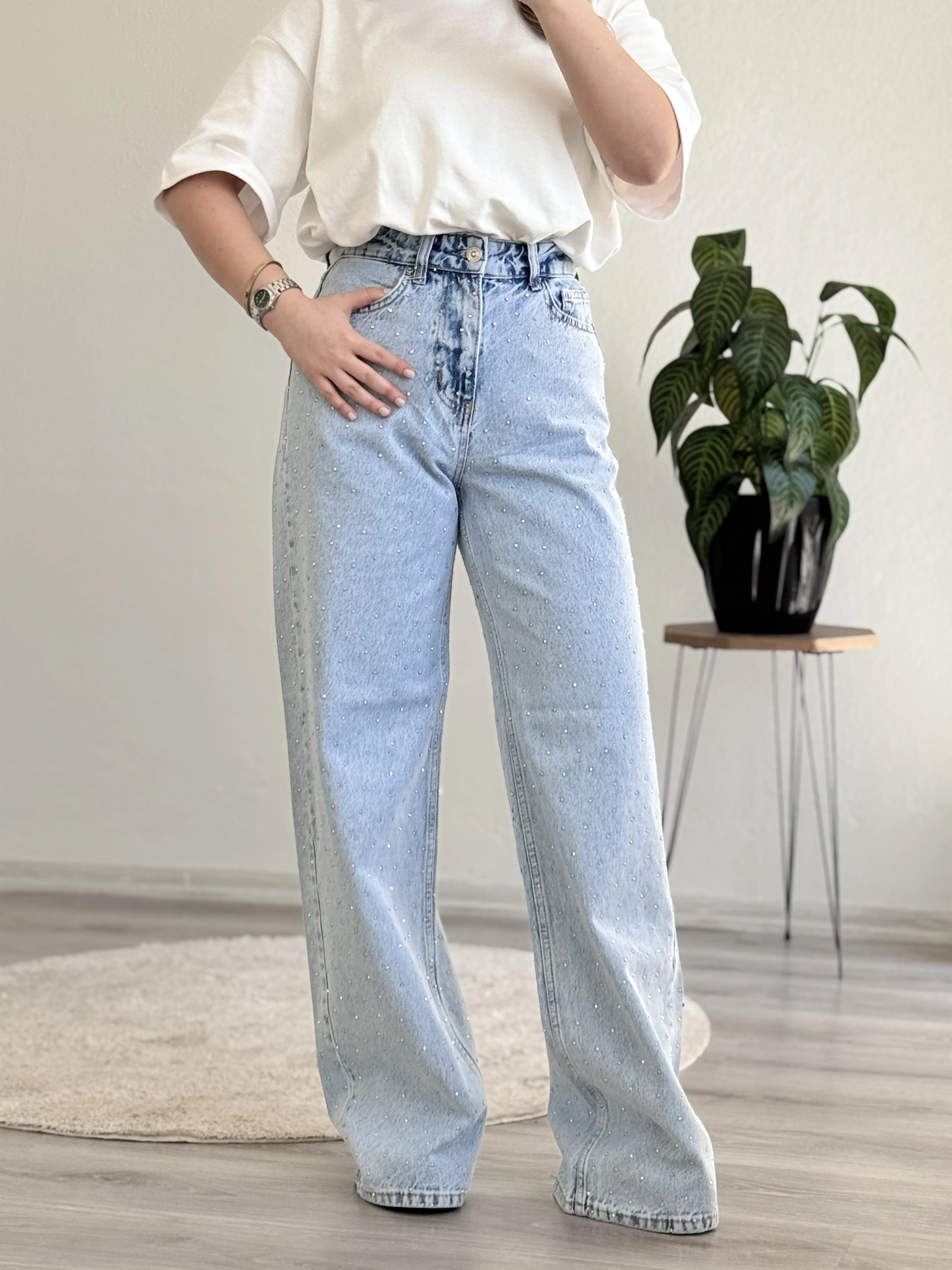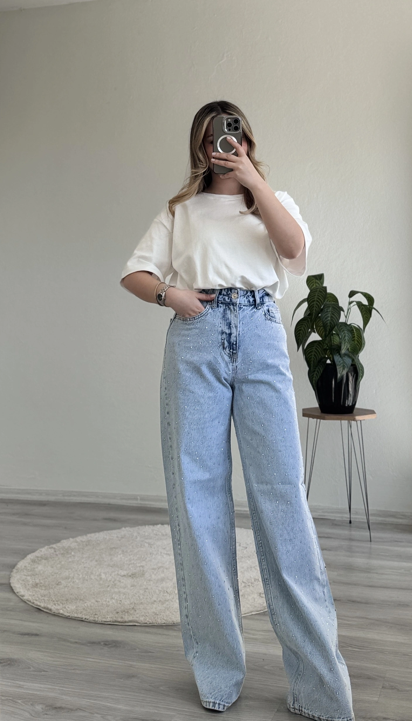 Taş detaylı Palazzo jean pantolon, rahat kesimi ve şık görünümüyle kombinlerinize modern bir dokunuş katıyor. Yüksek bel ve geniş paça kesimi sayesinde hem konforlu hem de trend bir görünüm sunar. Üzerindeki taş detayları pantolona zarif ve dikkat çekici bir stil kazandırır.