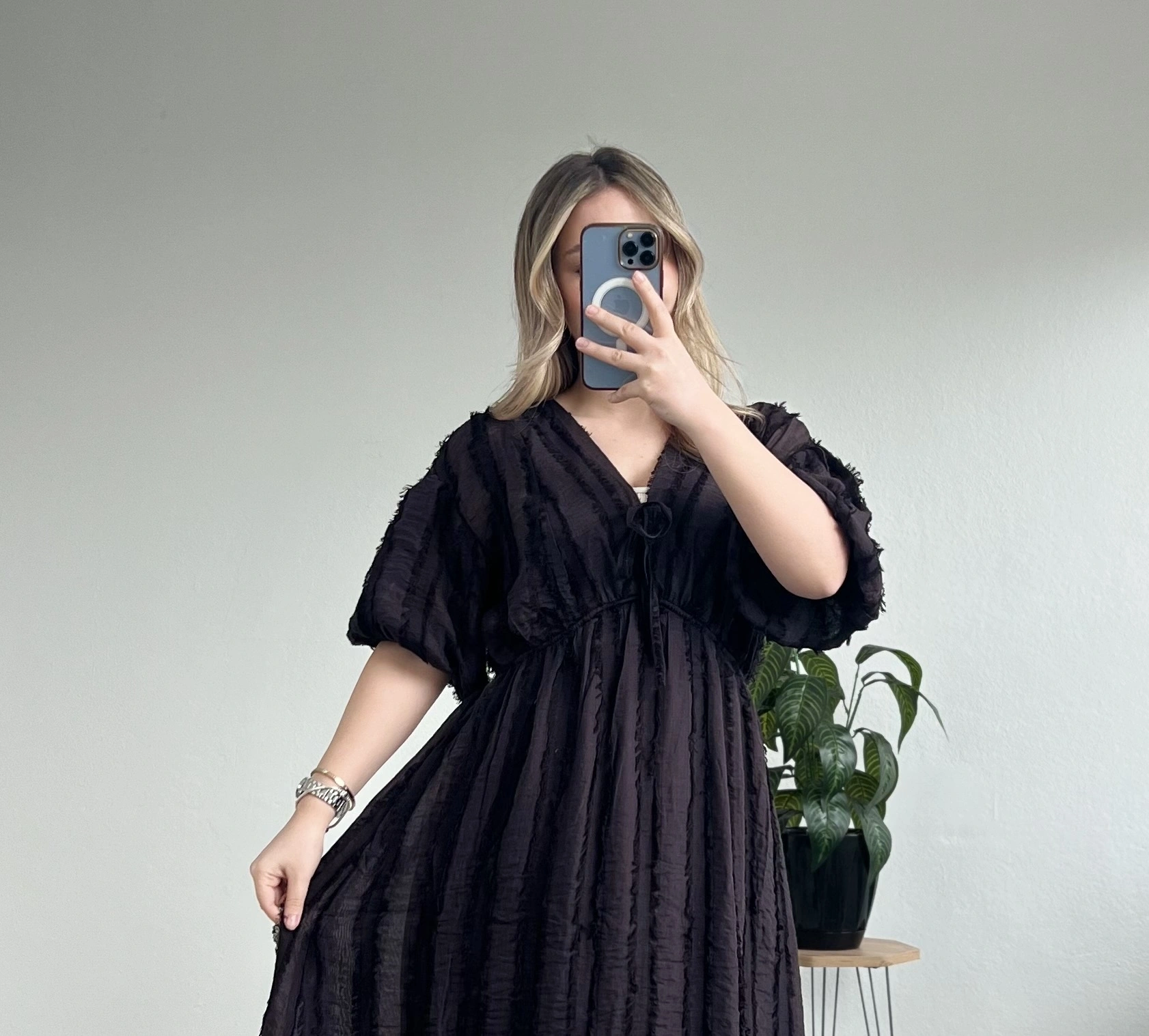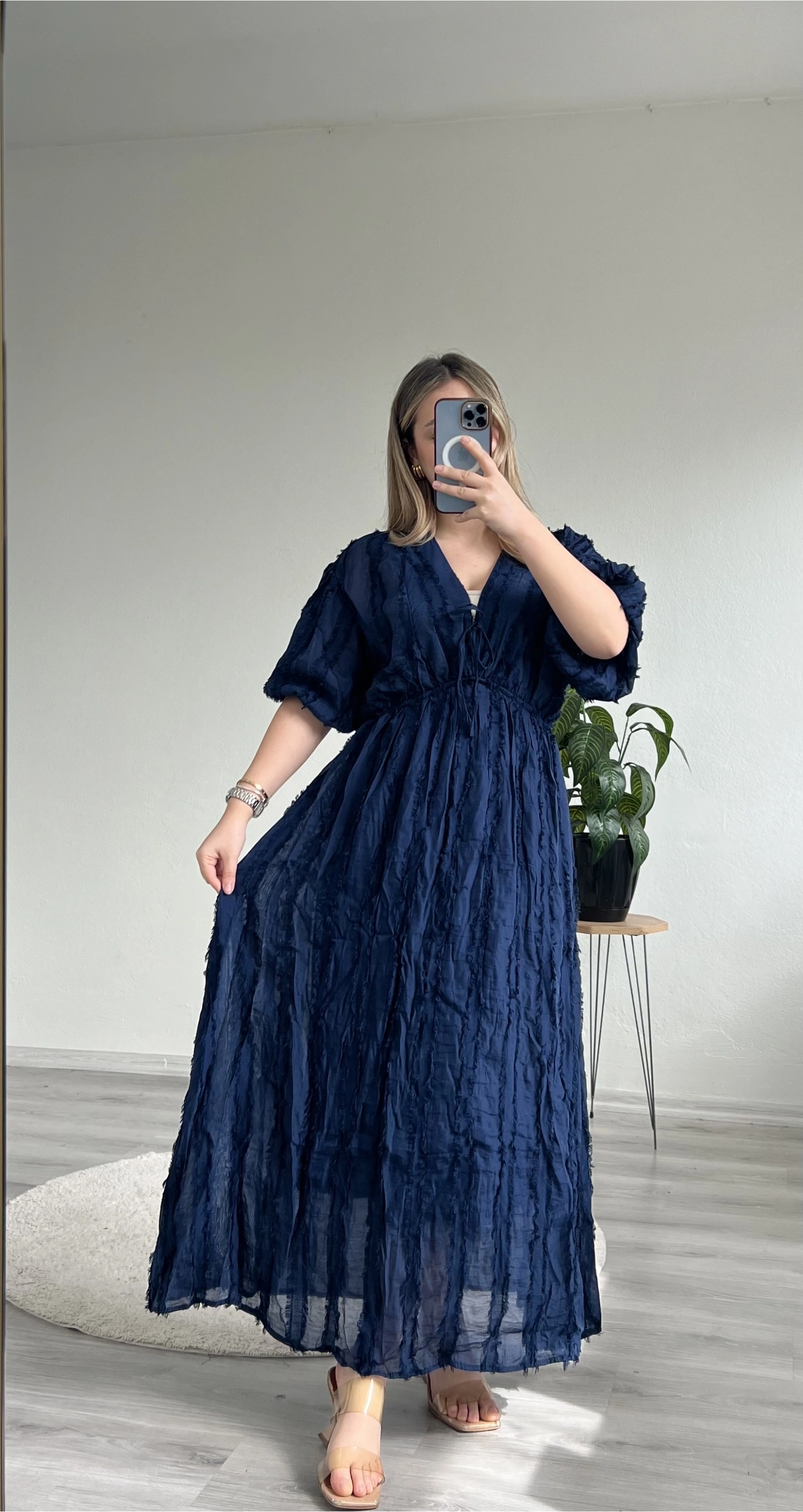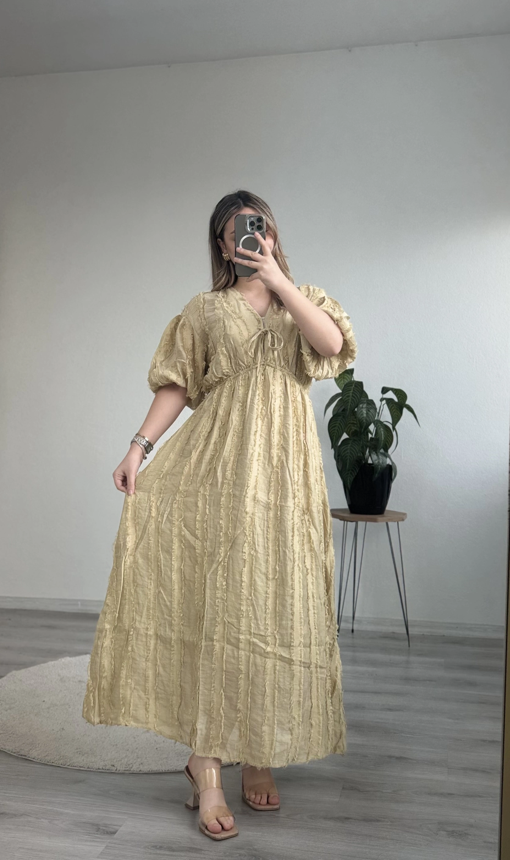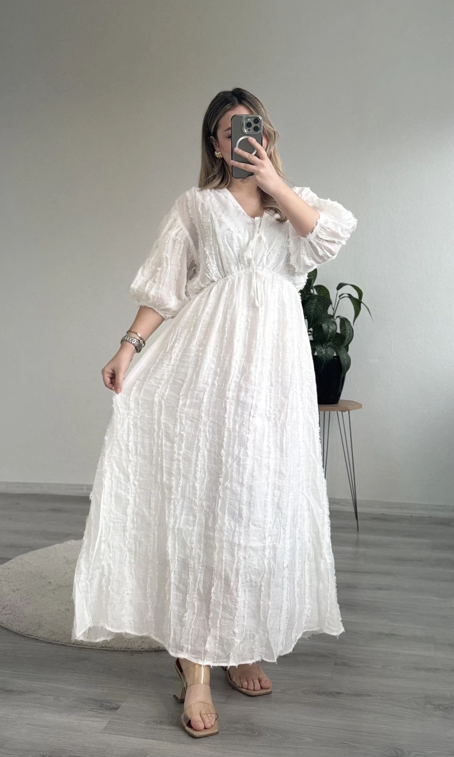 • BELİ LASTİKLİ BAĞLAMALI SAÇAKLI ELBİSE