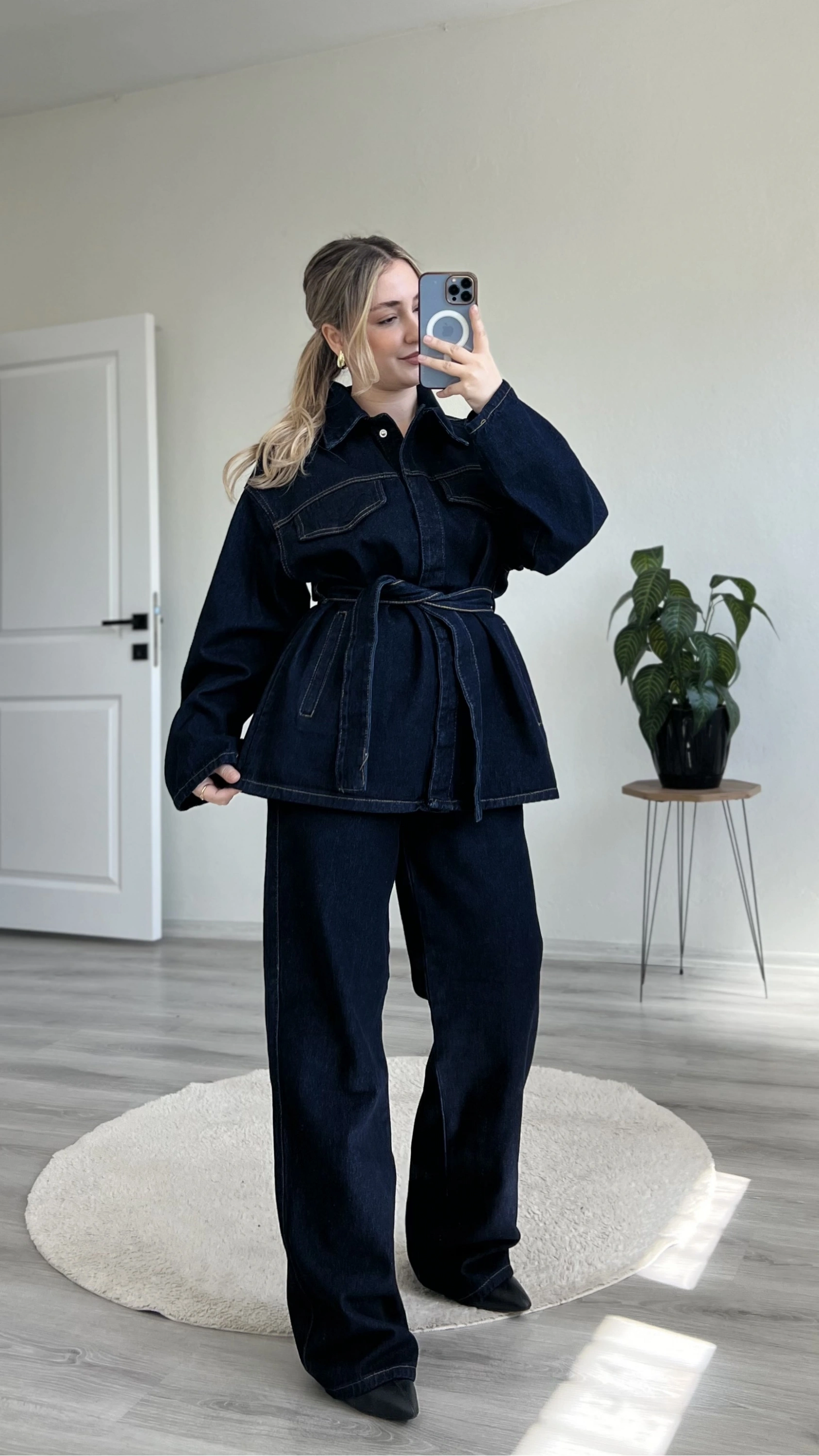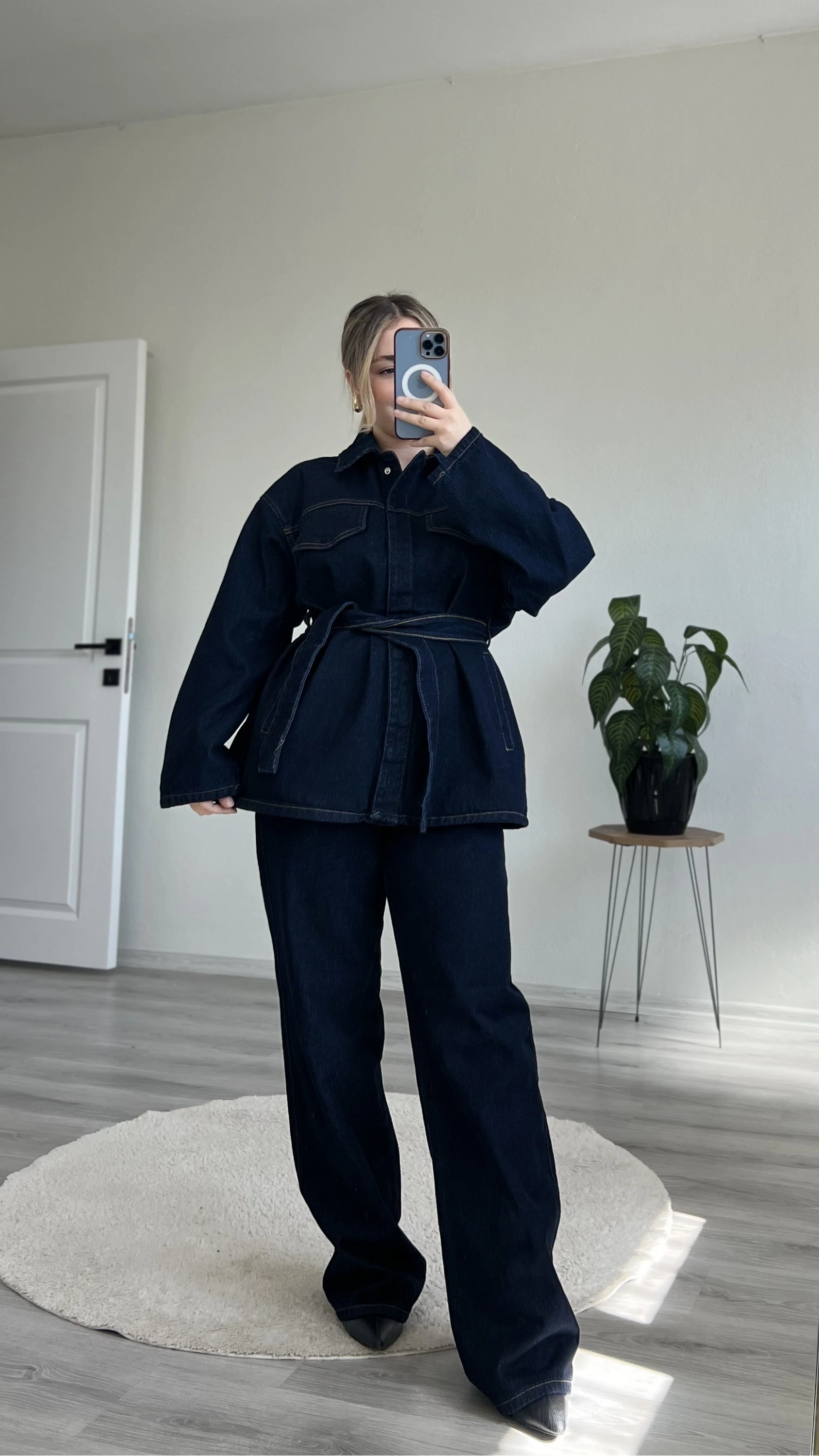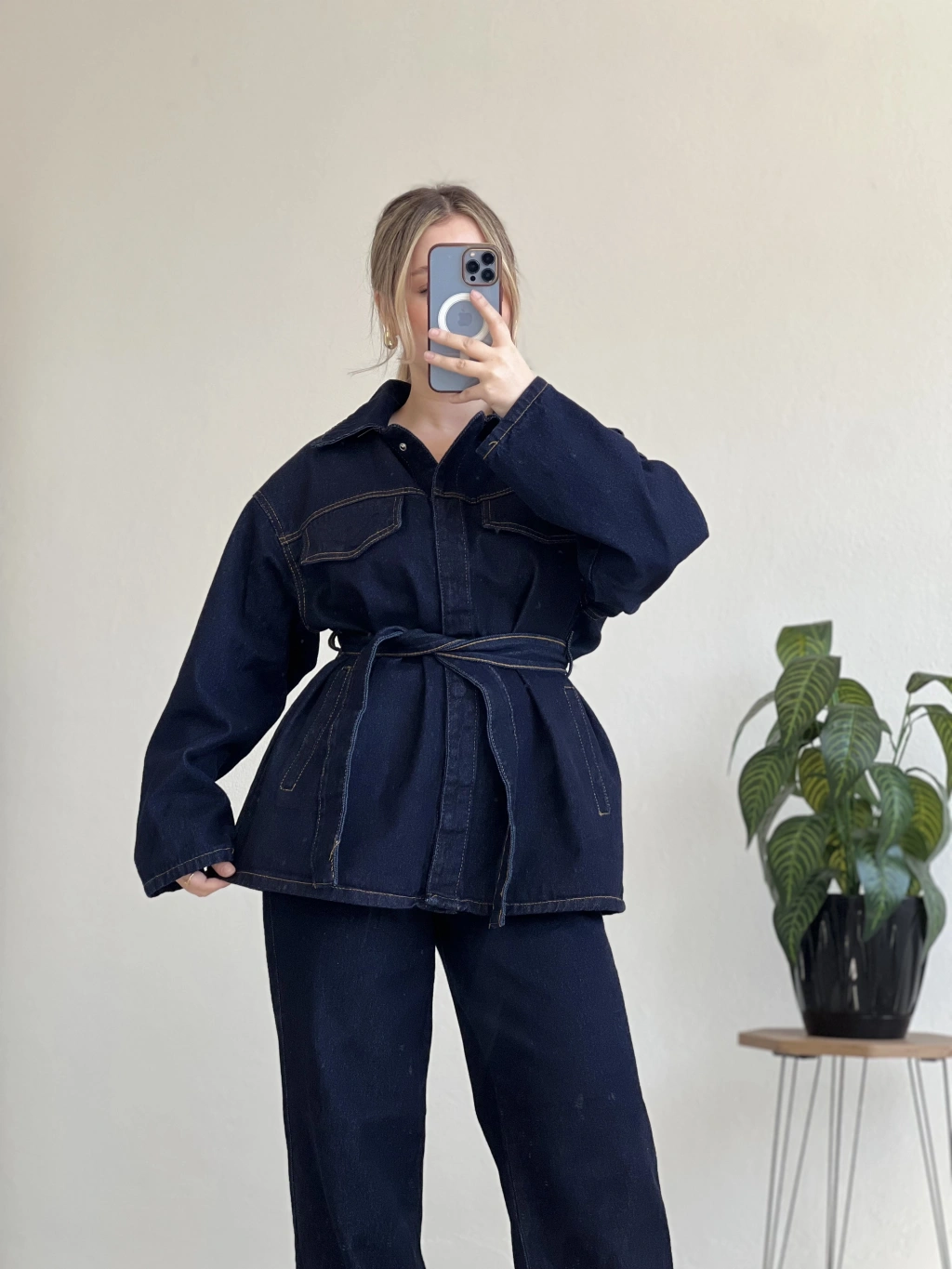 Modern ve iddialı bir görünüm arayanlar için tasarlanan bel bağlamalı kot takım, hem rahat hem güçlü bir siluet sunar.