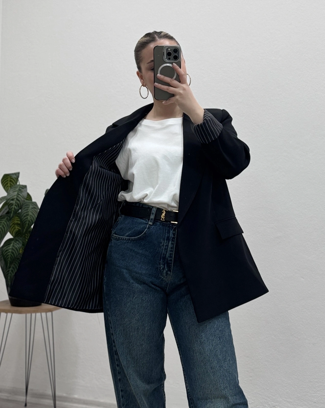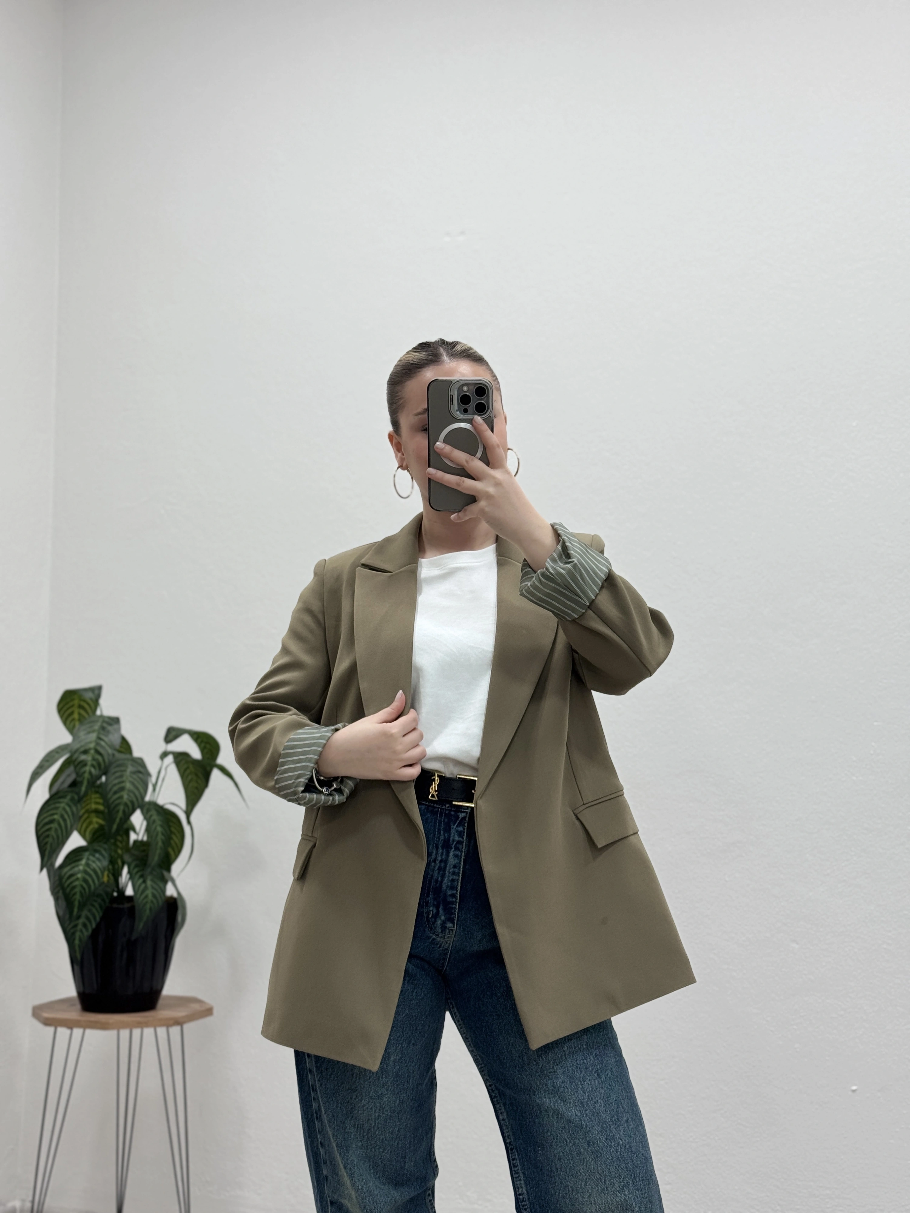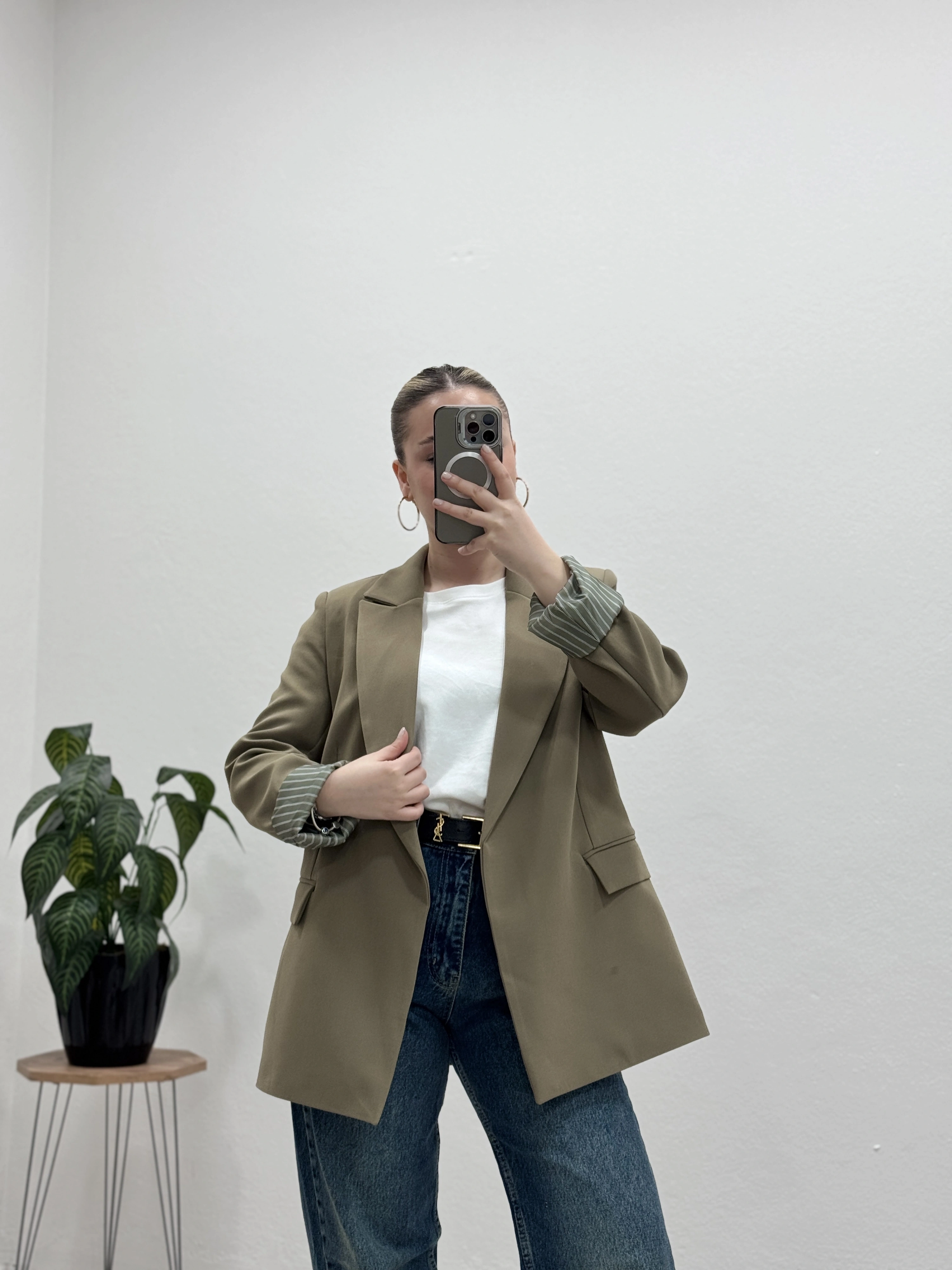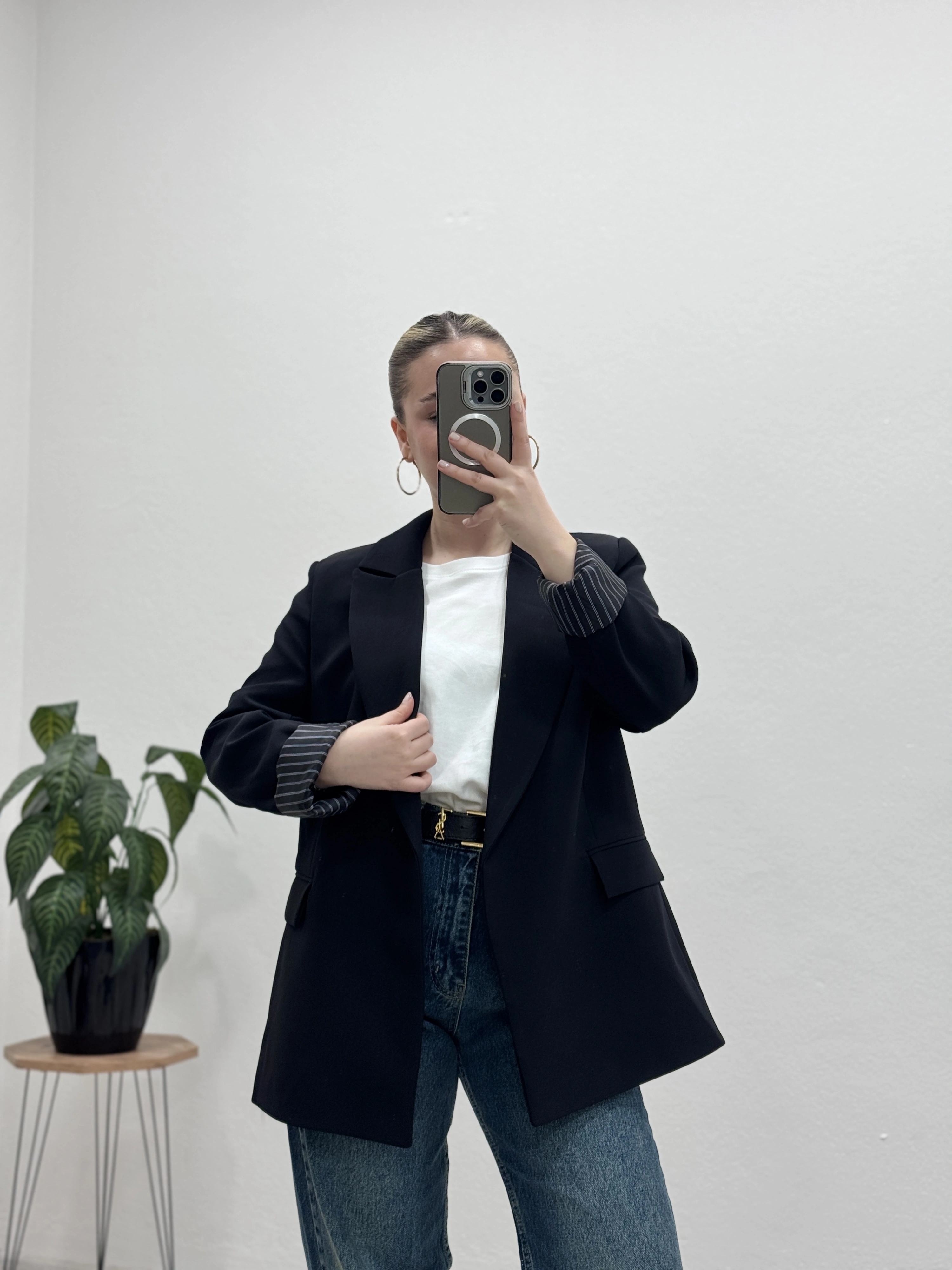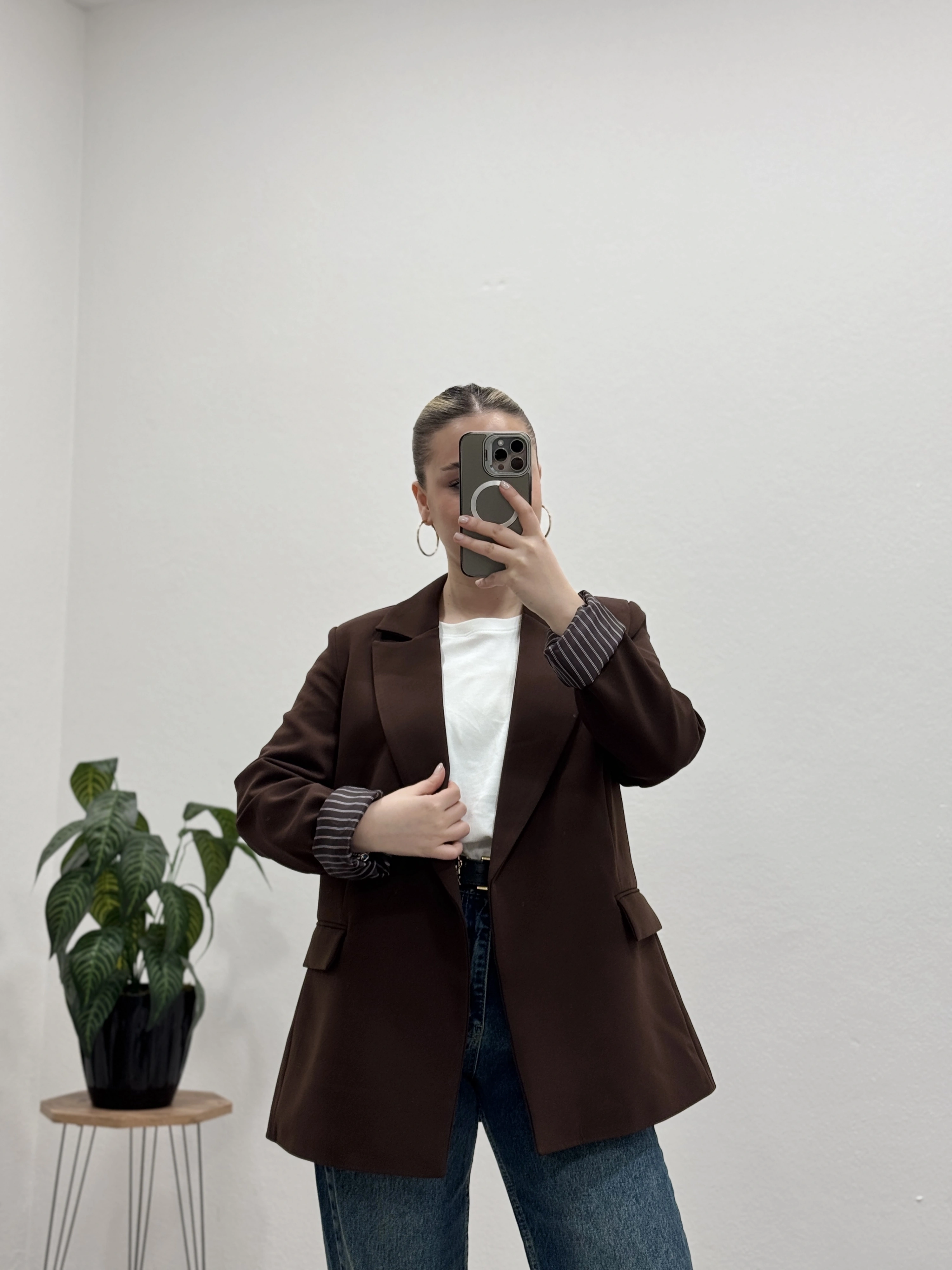 İç astarı çizgili blazer ceket, modern ve şık görünümüyle kombinlerinize güçlü bir dokunuş katıyor.