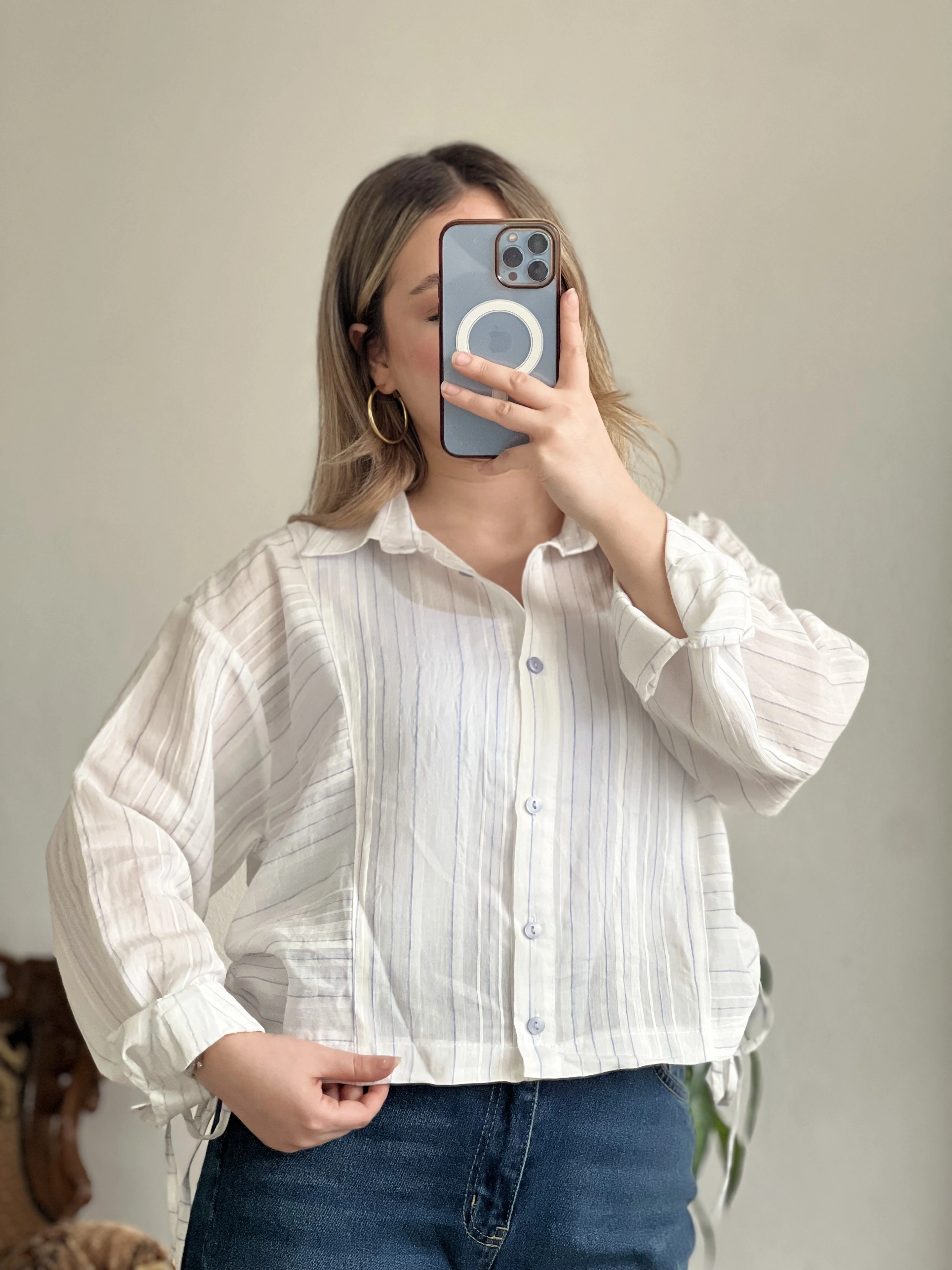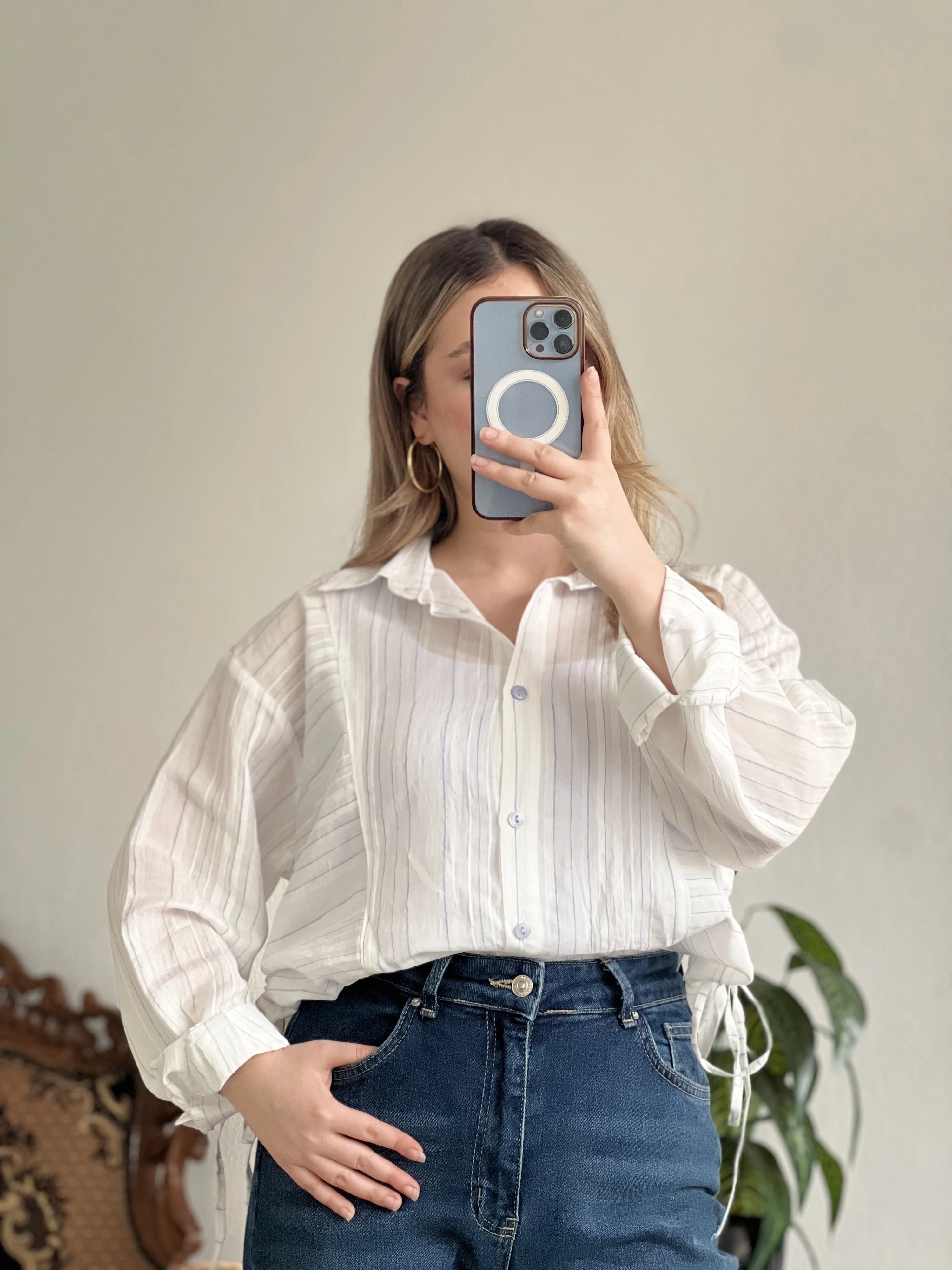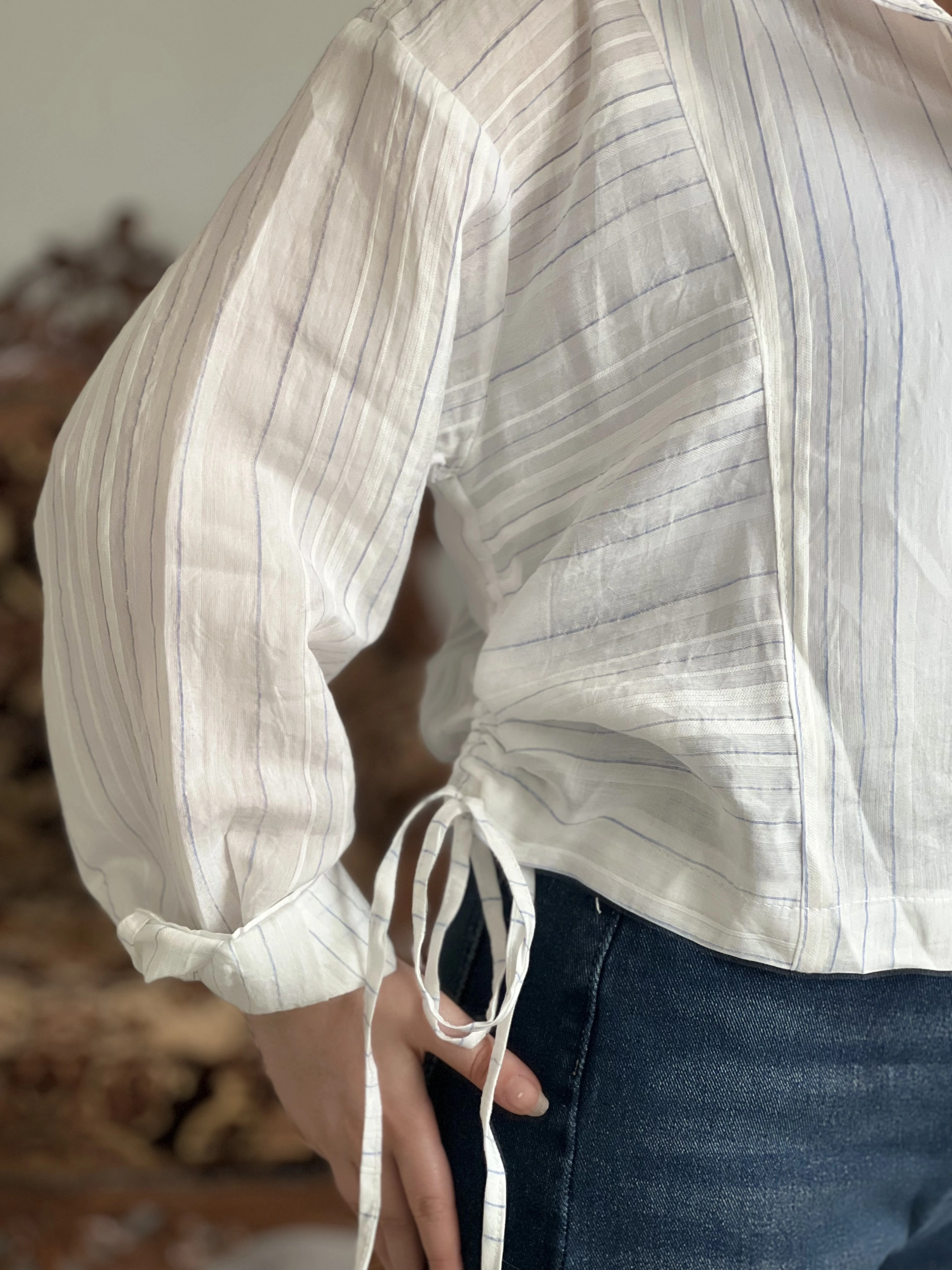 KETEN ÇİZGİLİ YANDAN BÜZGÜLÜ GÖMLEK