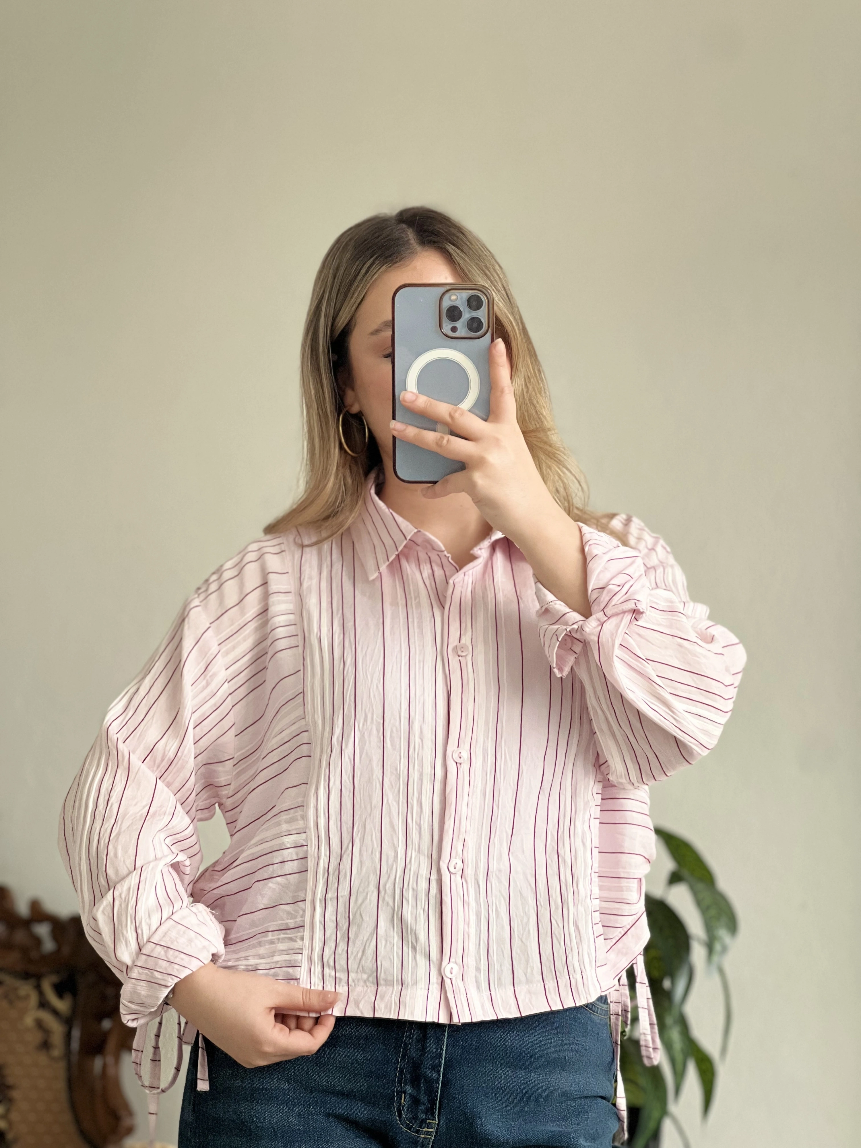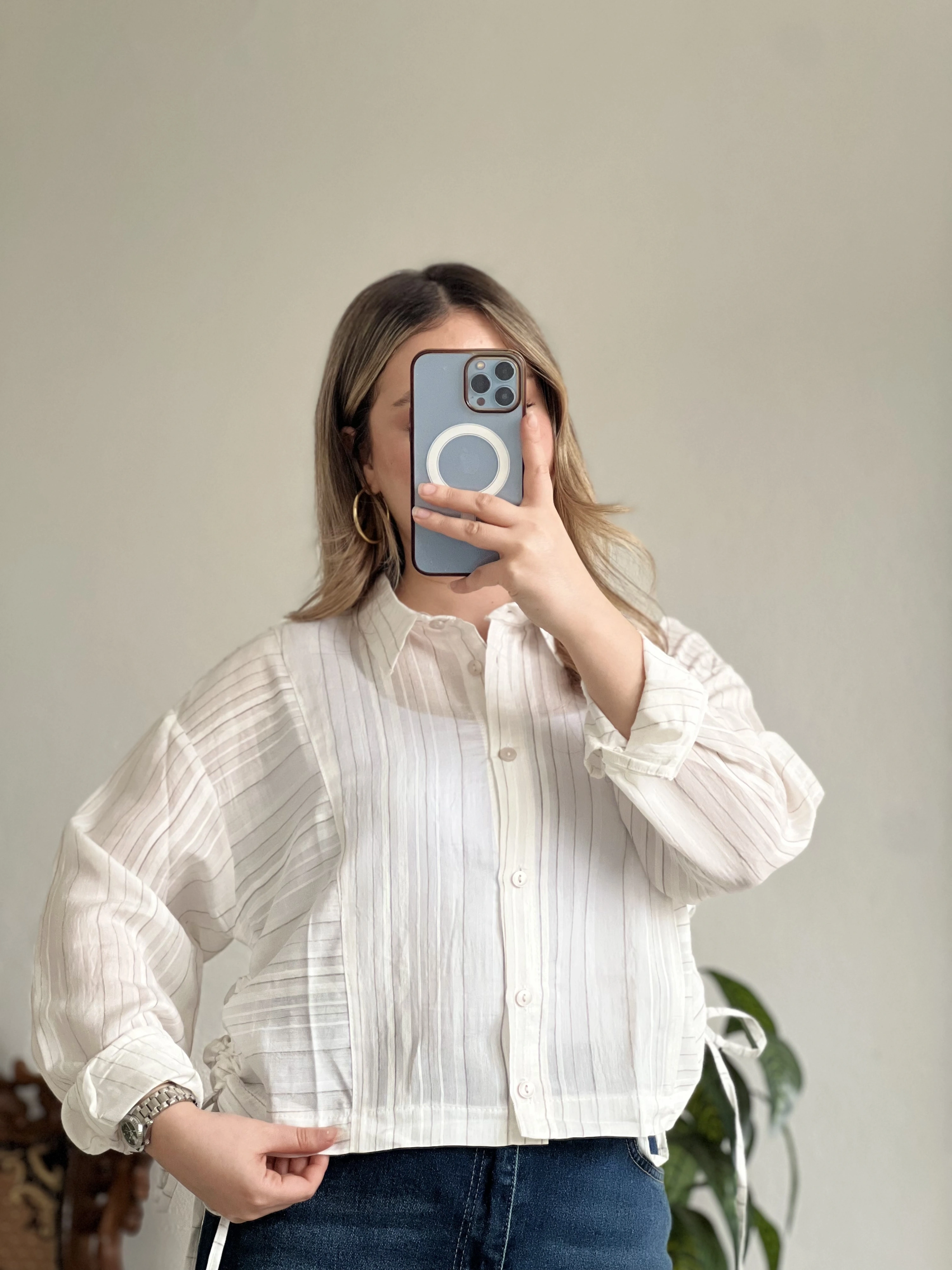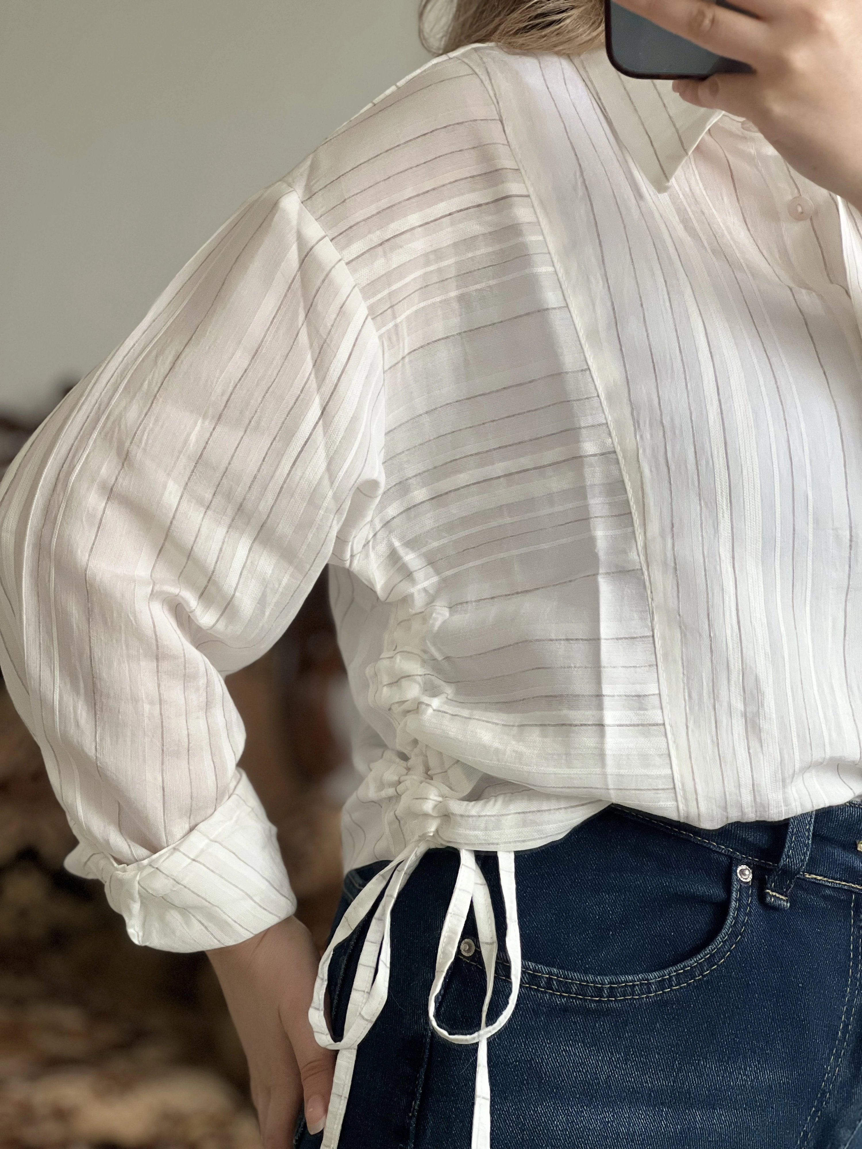 KETEN ÇİZGİLİ YANDAN BÜZGÜLÜ GÖMLEK