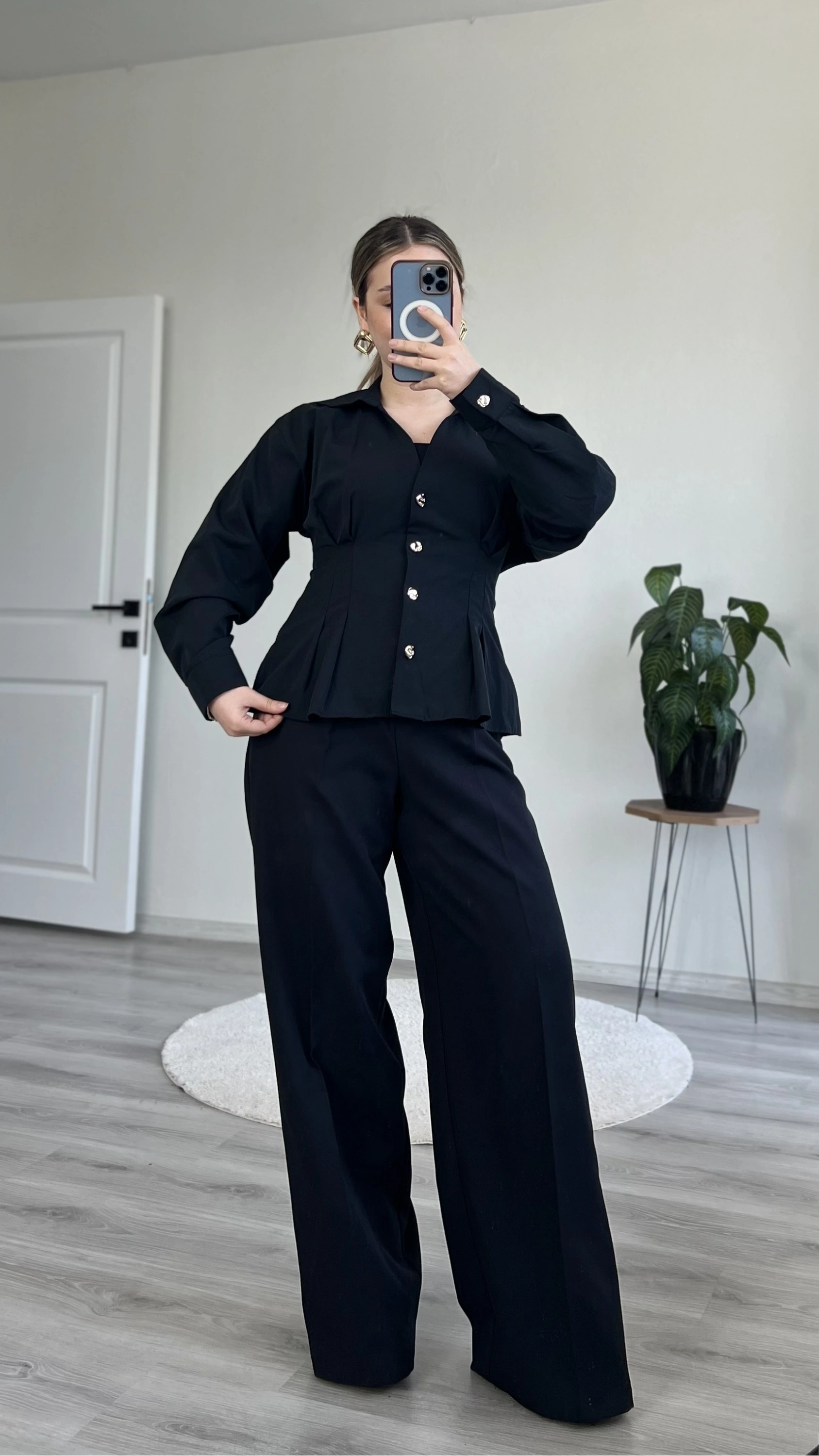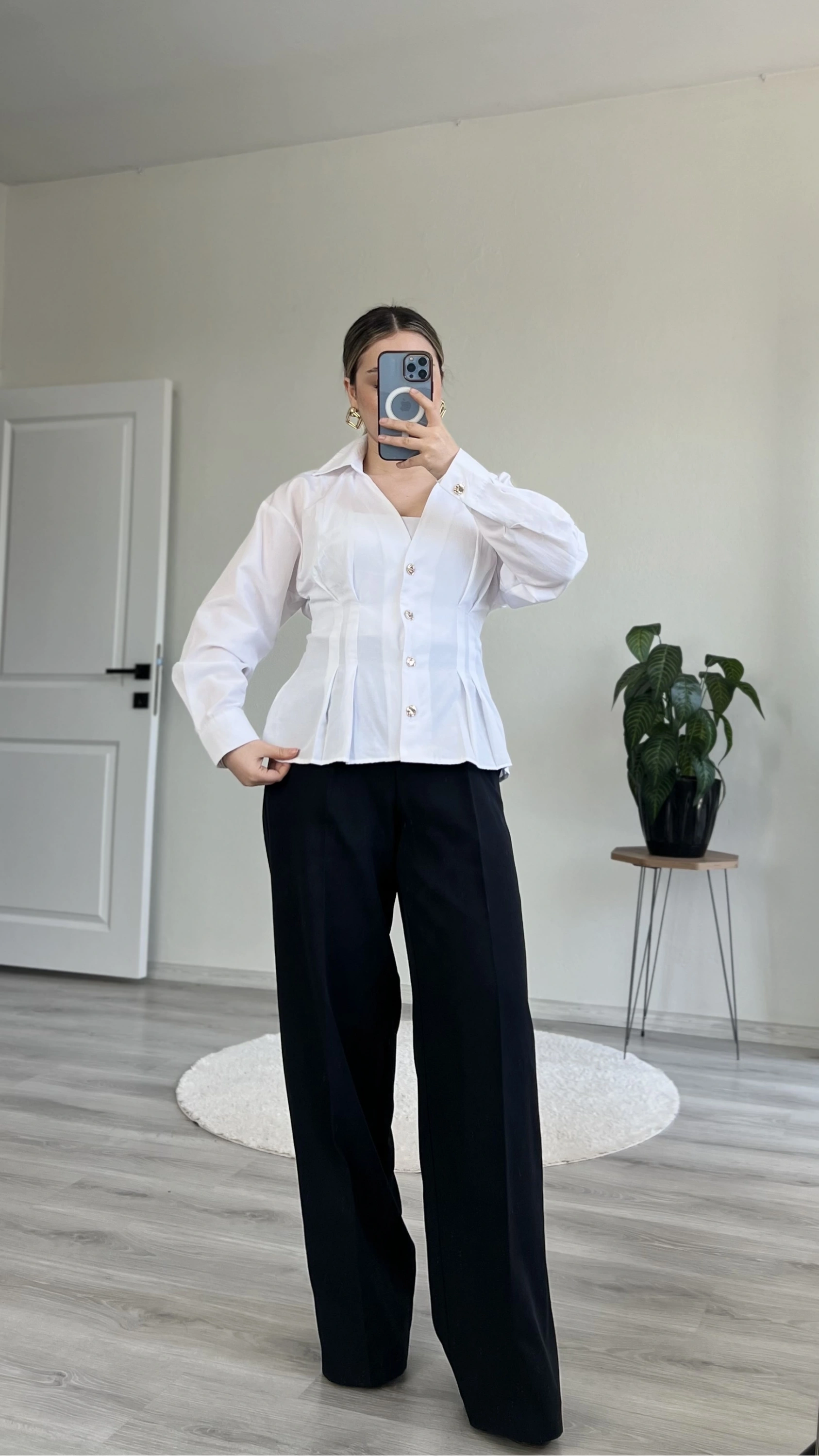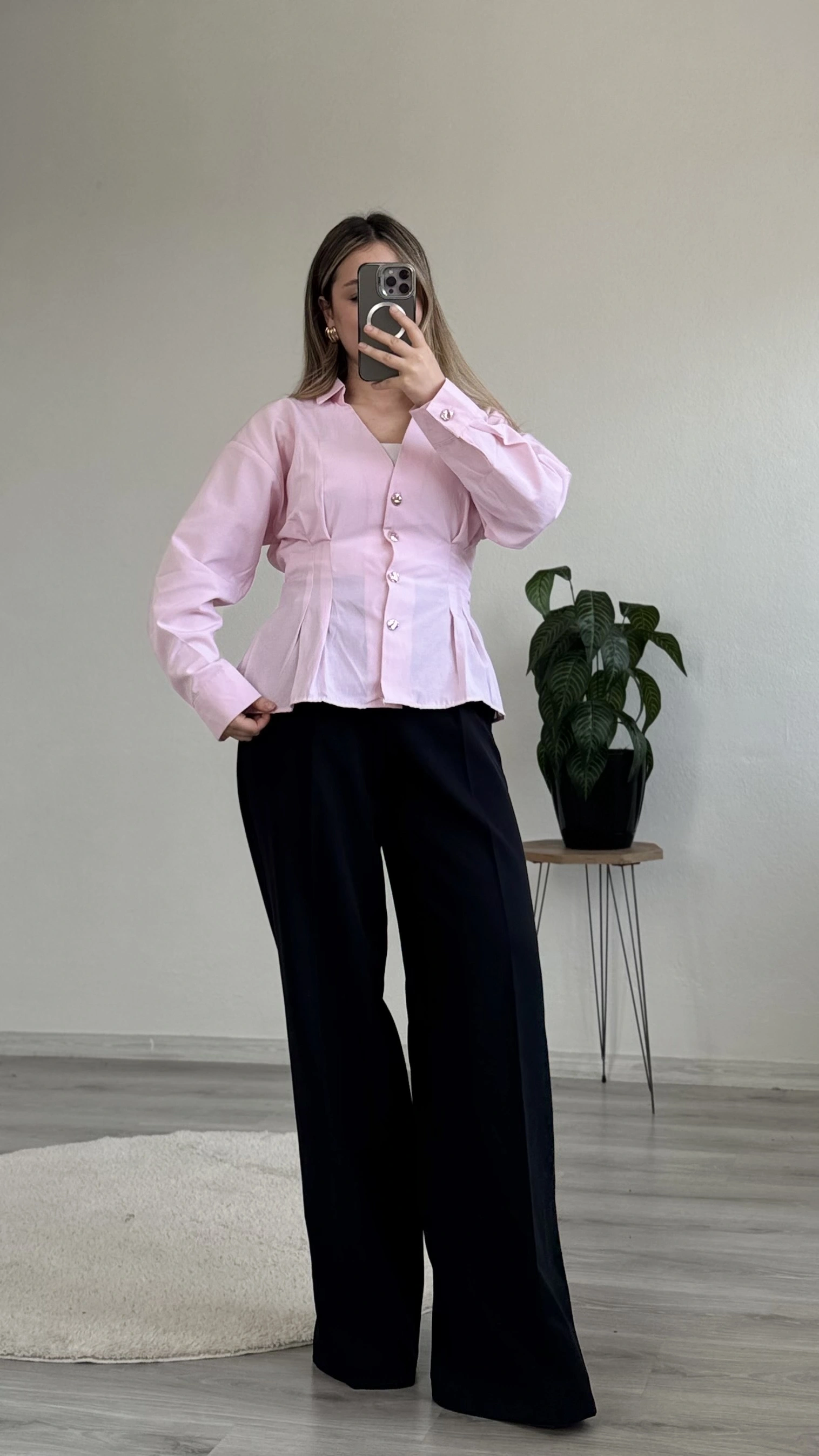 • ÖNDEN V İNEN PENSLİ DÜĞME DETAYLI GÖMLEK