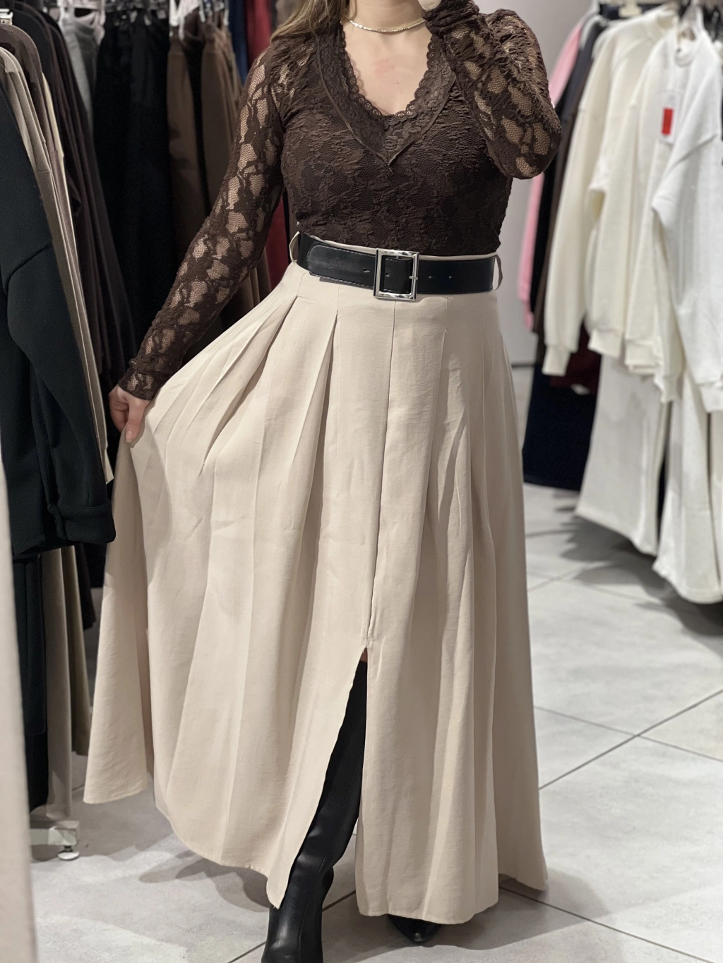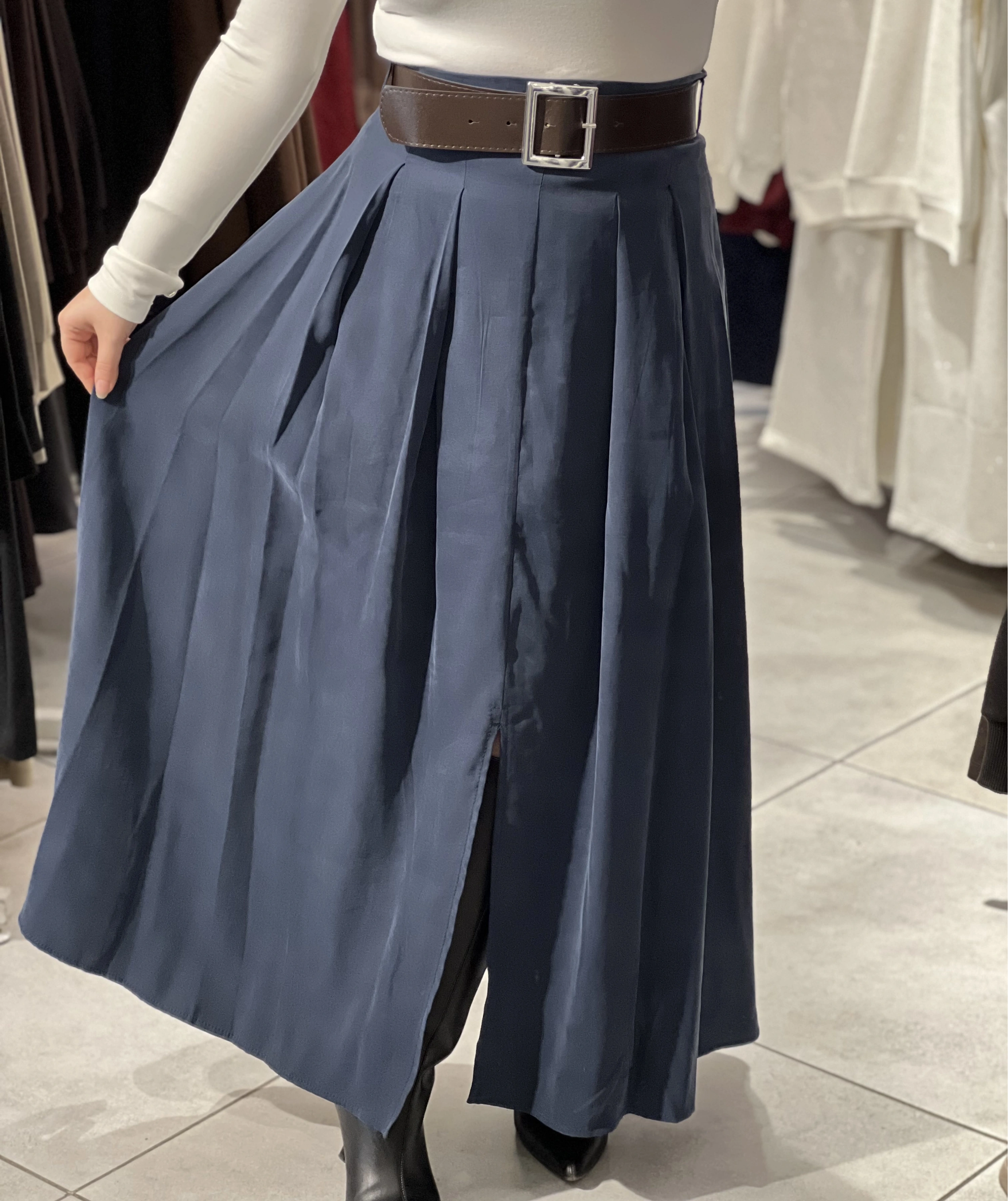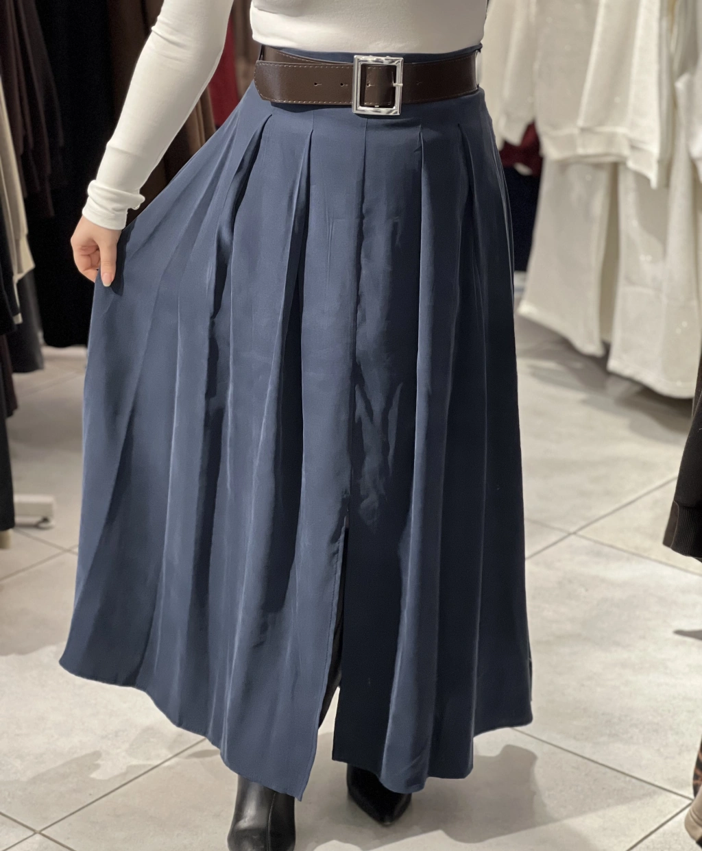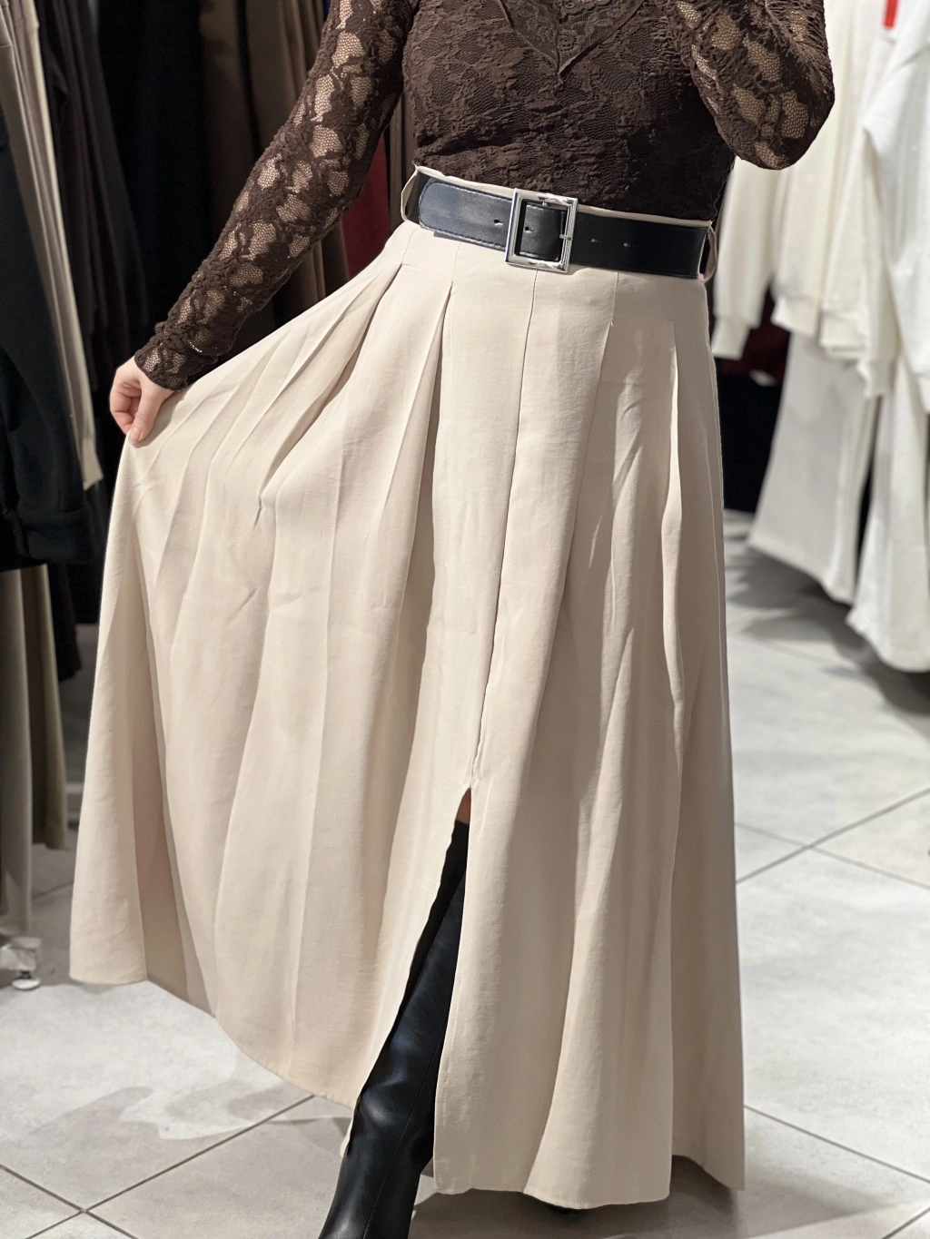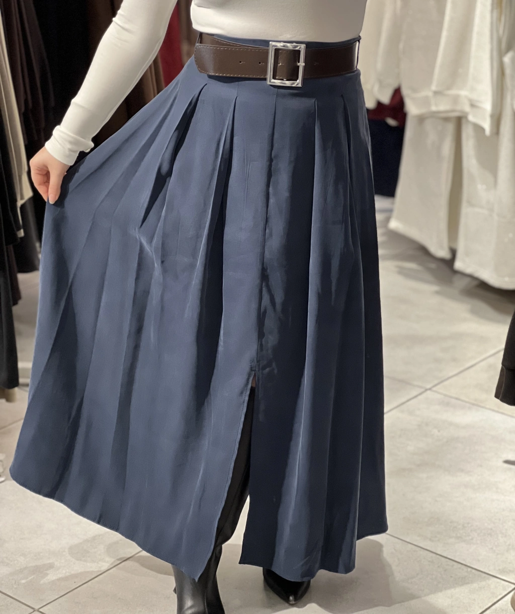 Akışkan kumaş ve pile detaylarıyla şık ve rahat bir etek. Günlük ve şık kombinler için ideal.