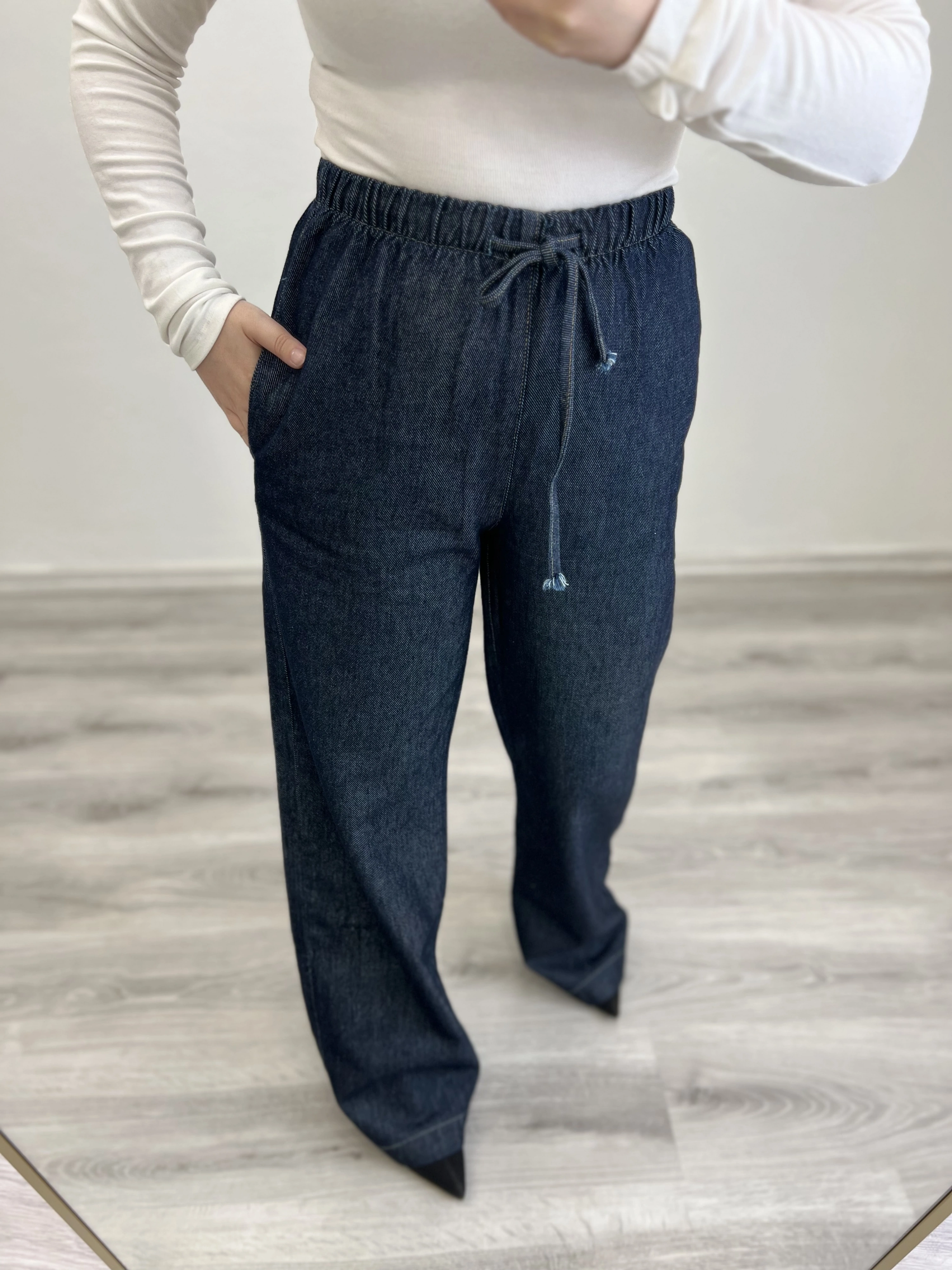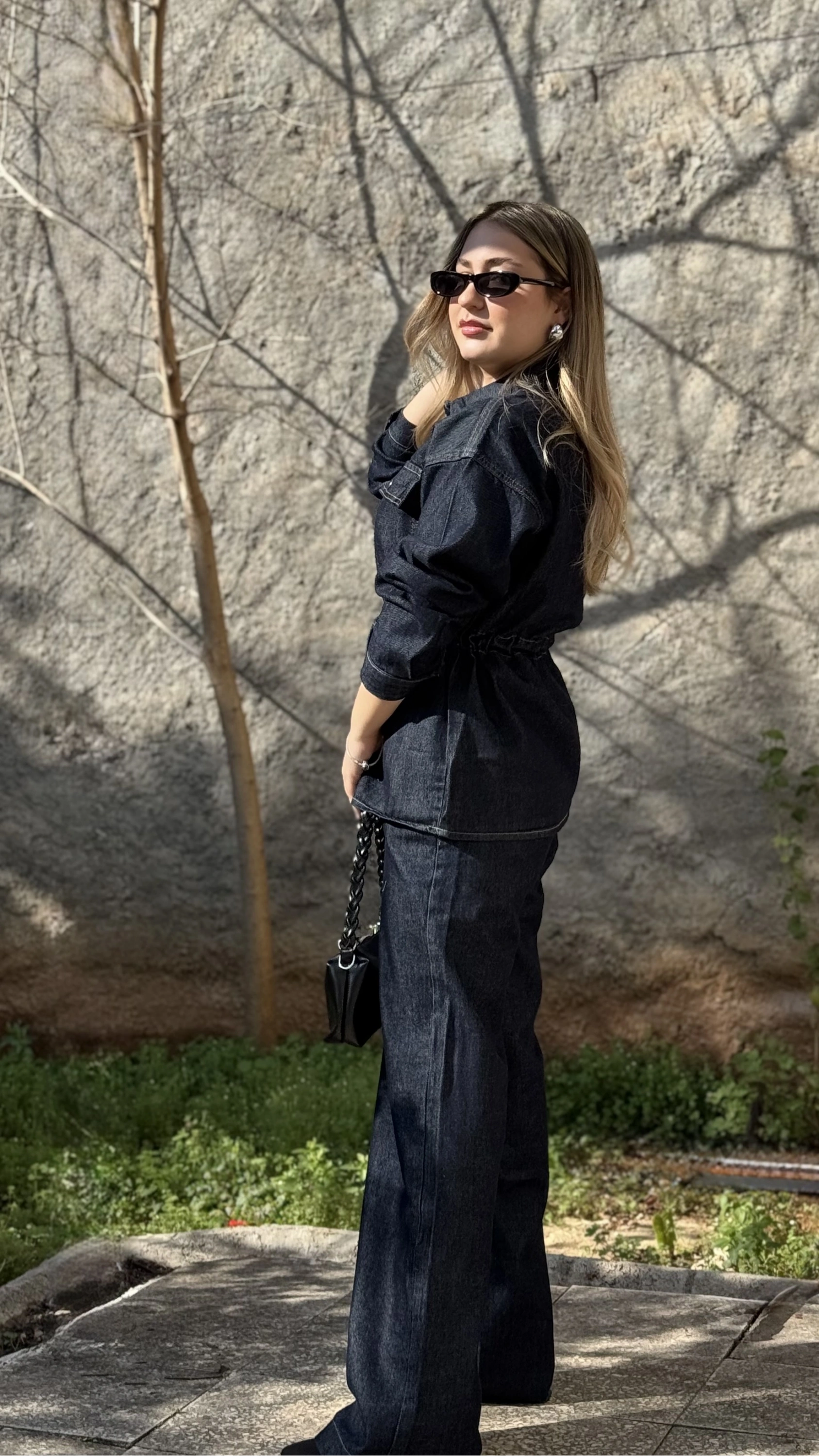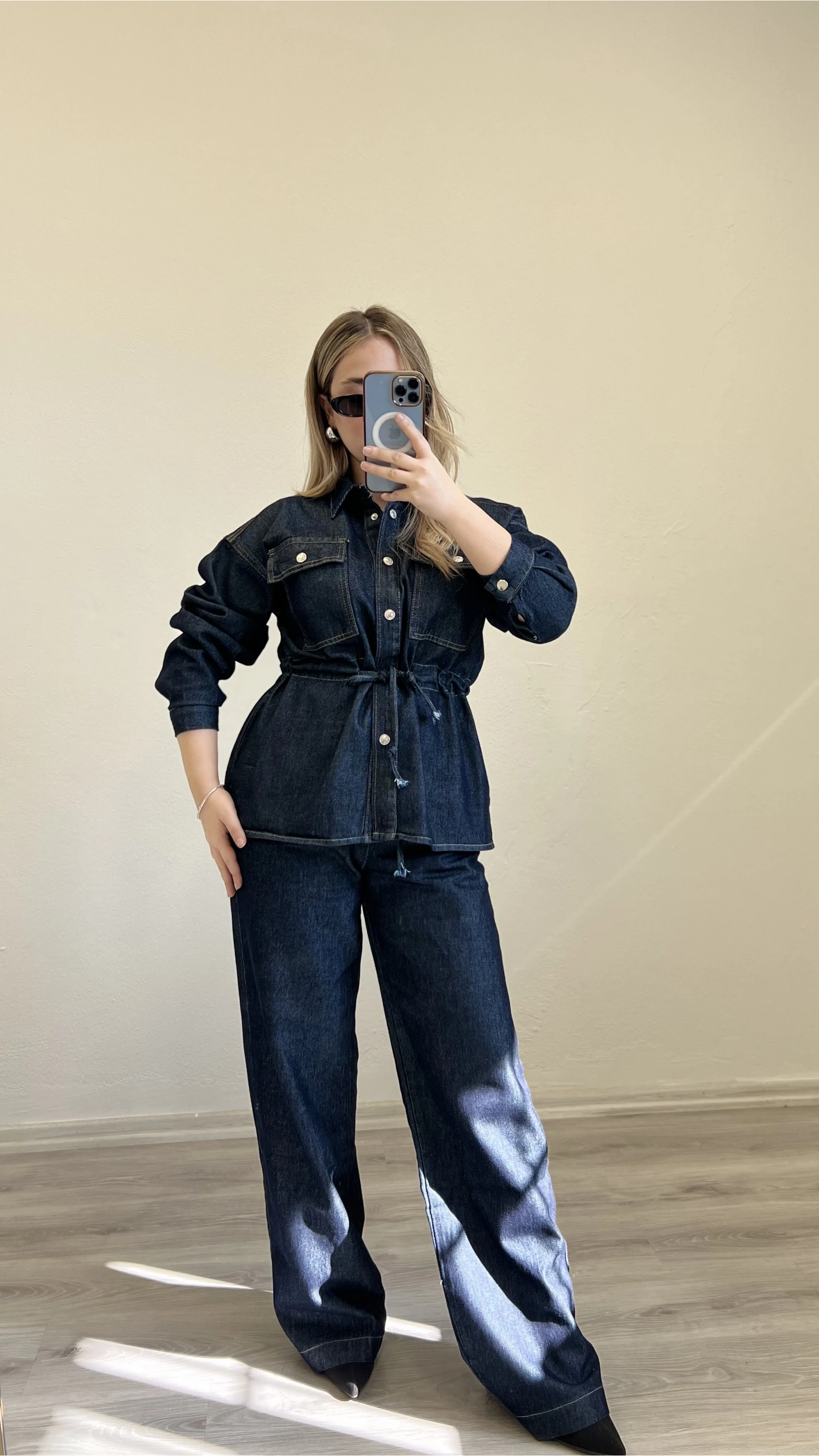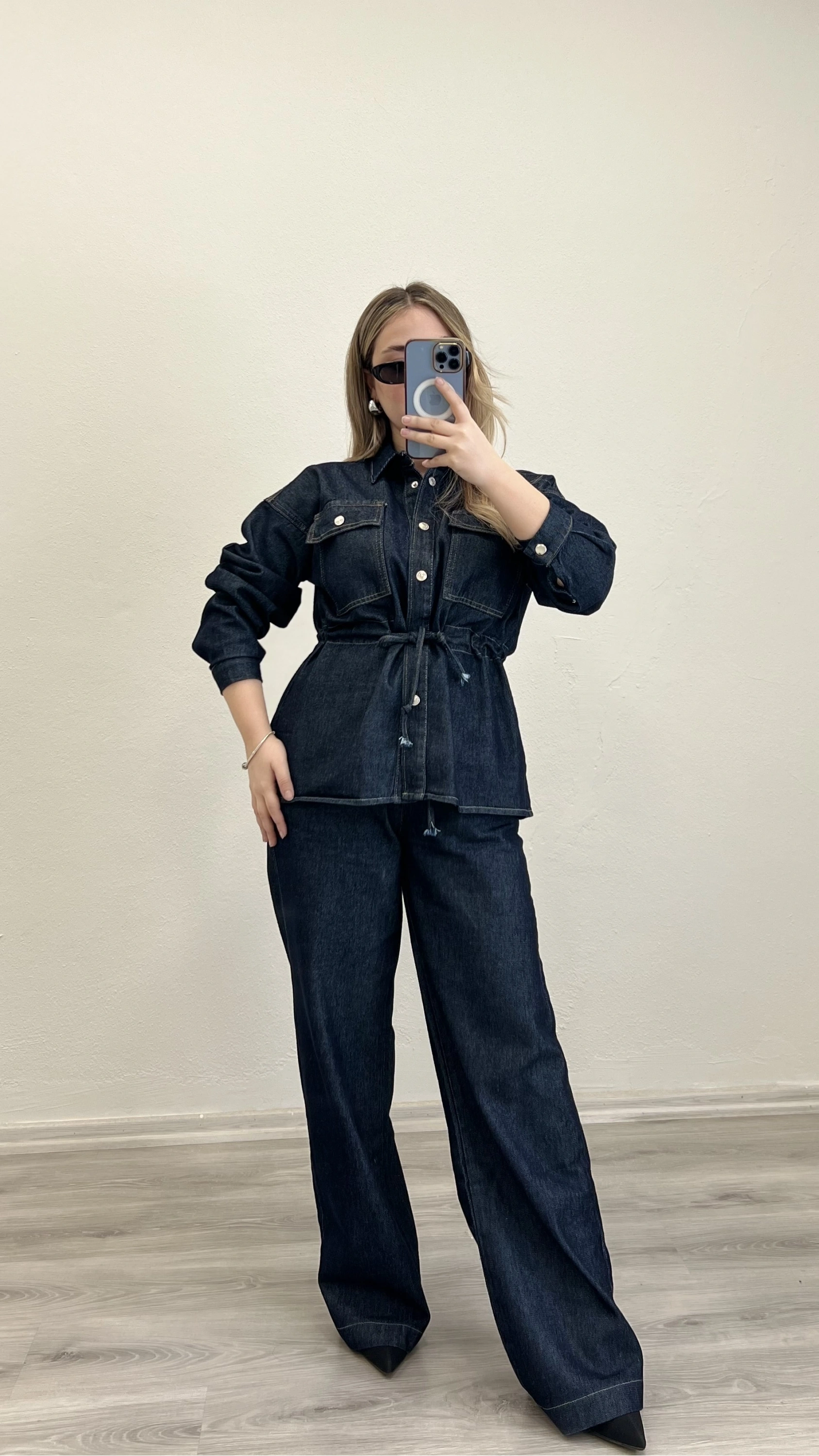Modern ve iddialı bir görünüm arayanlar için tasarlanan bel bağlamalı kot takım, hem rahat hem güçlü bir siluet sunar.