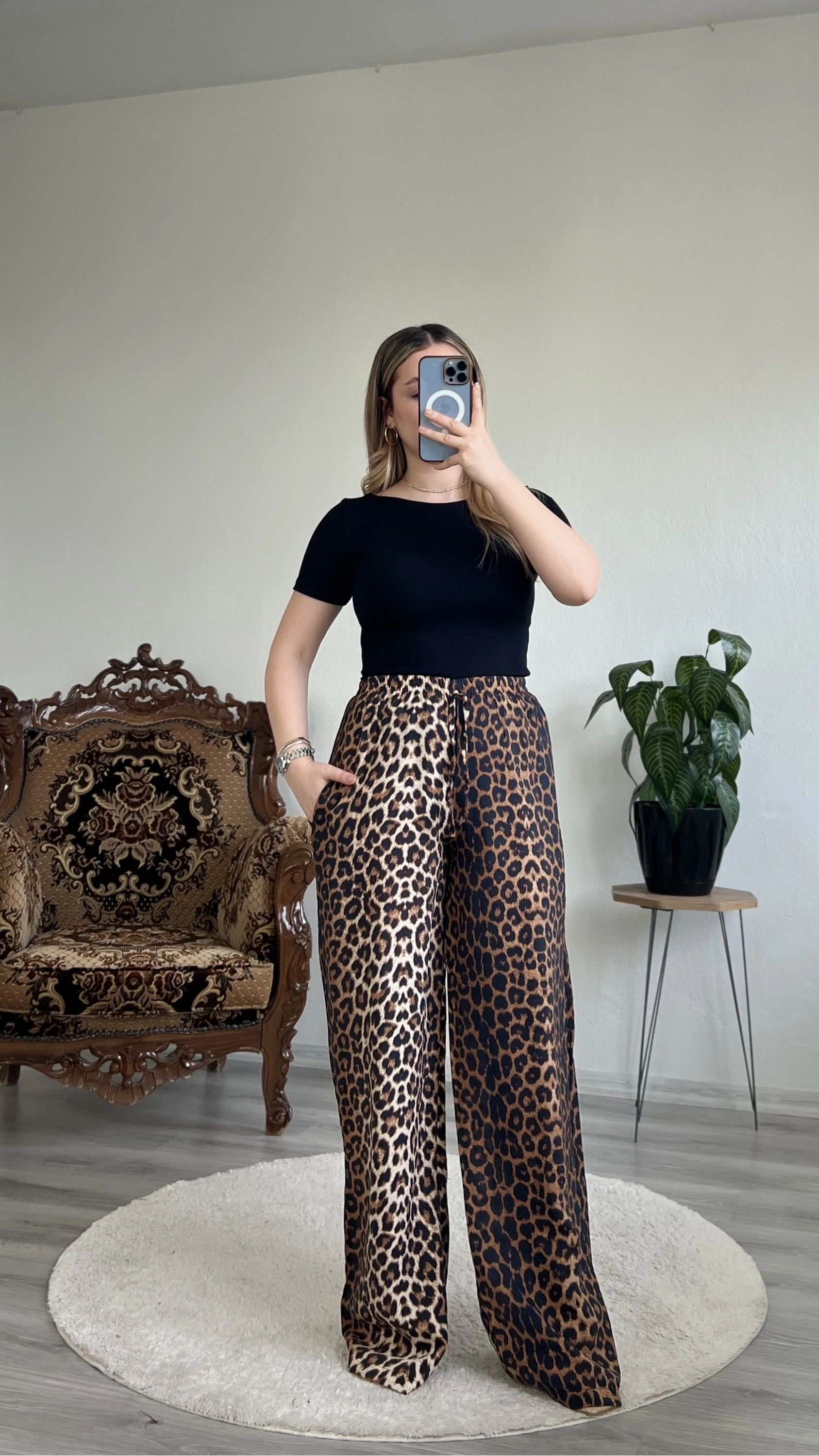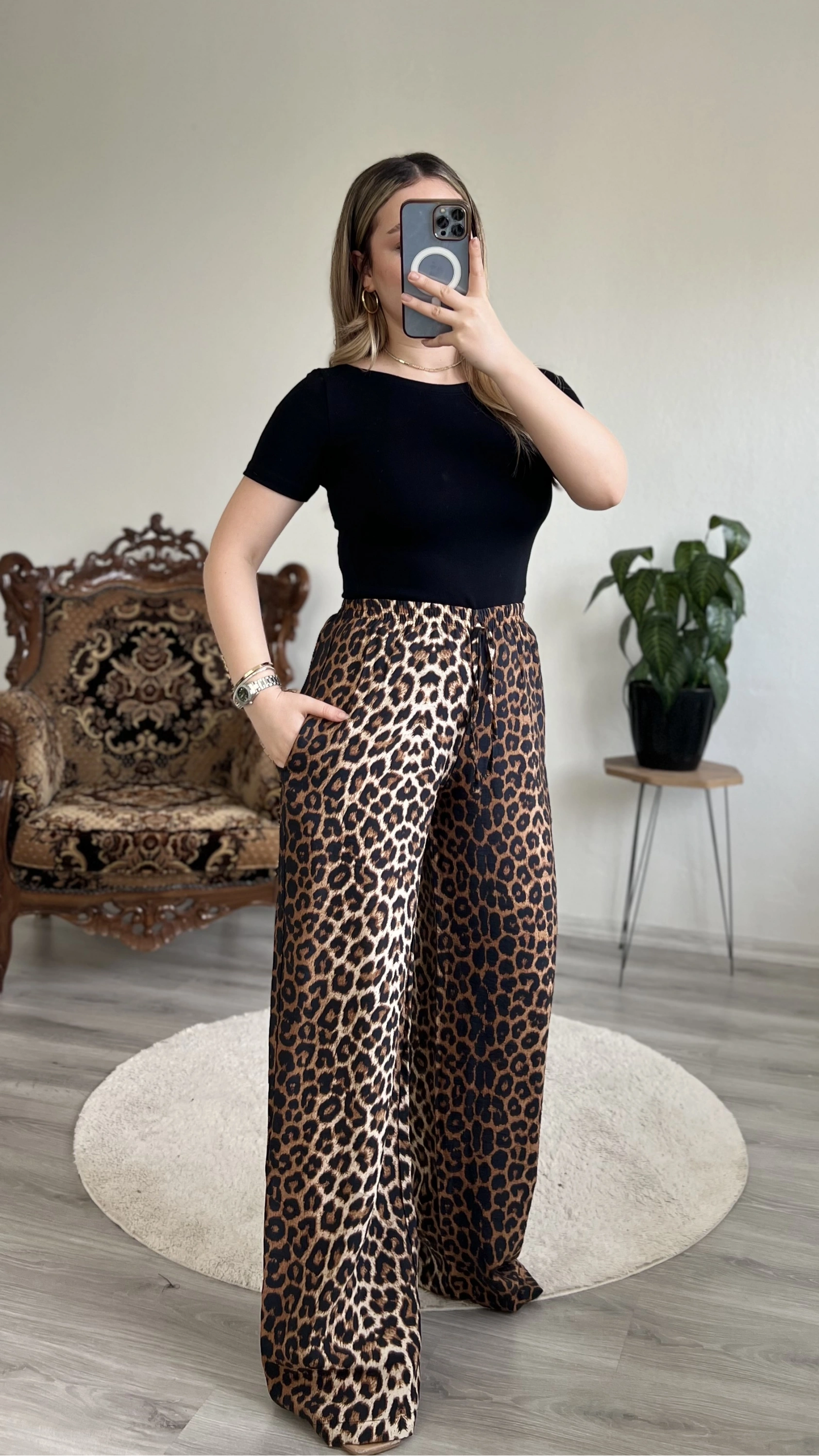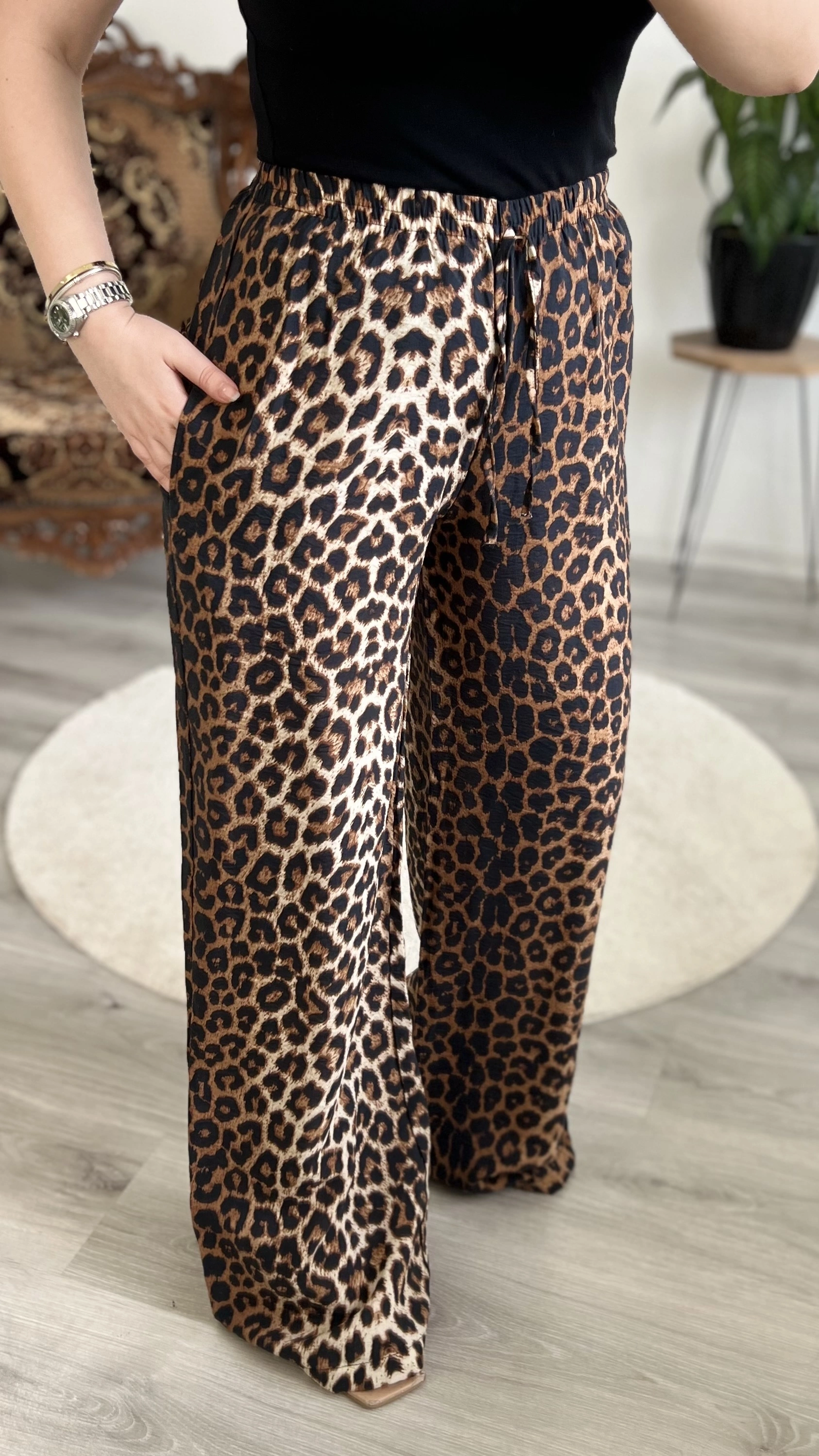 Leopar desenli saten bol paça pantolon, şıklığı ve rahatlığı bir arada sunar. Akışkan saten kumaşı sayesinde zarif bir duruş sağlar. Yüksek bel ve bol paça kesimi ile hem günlük hem özel kombinlerde rahatlıkla kullanılabilir.