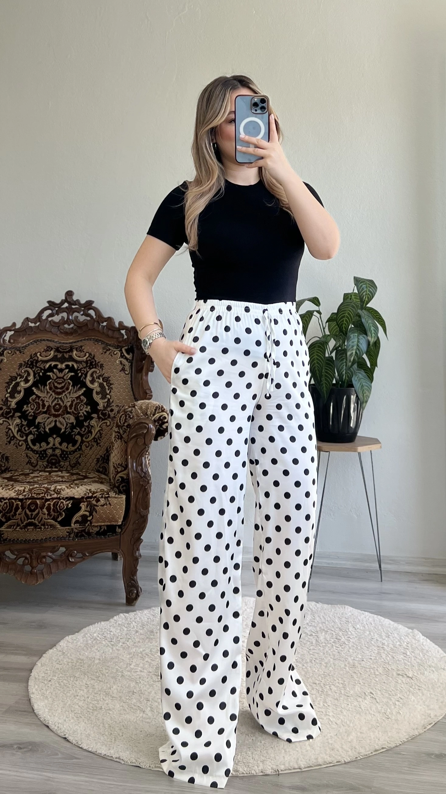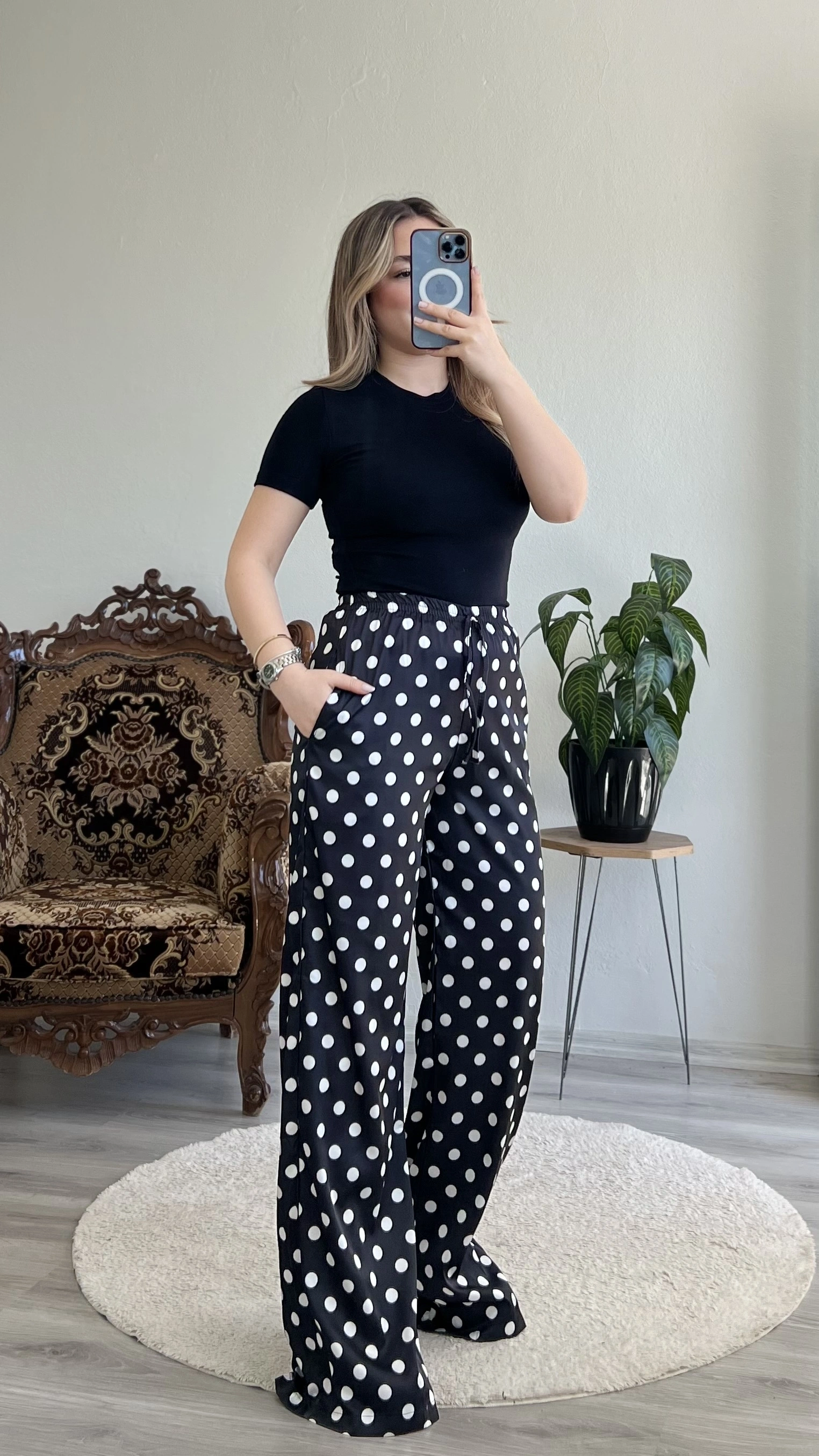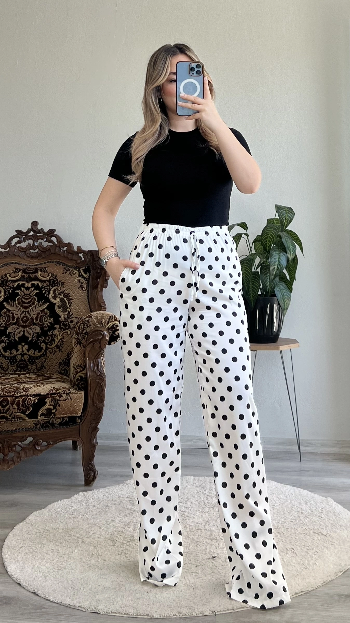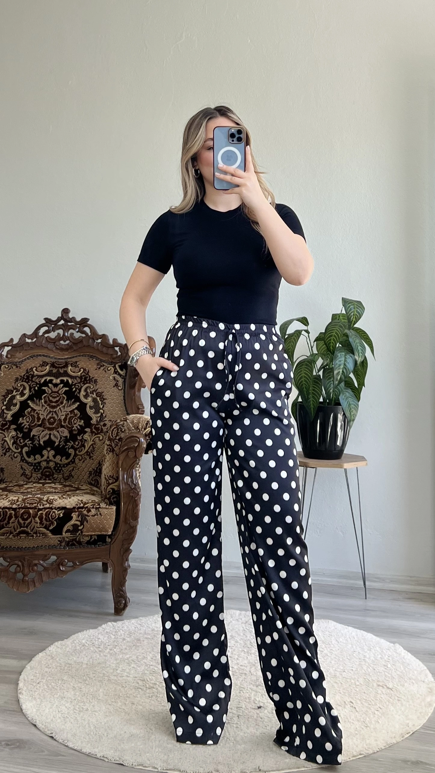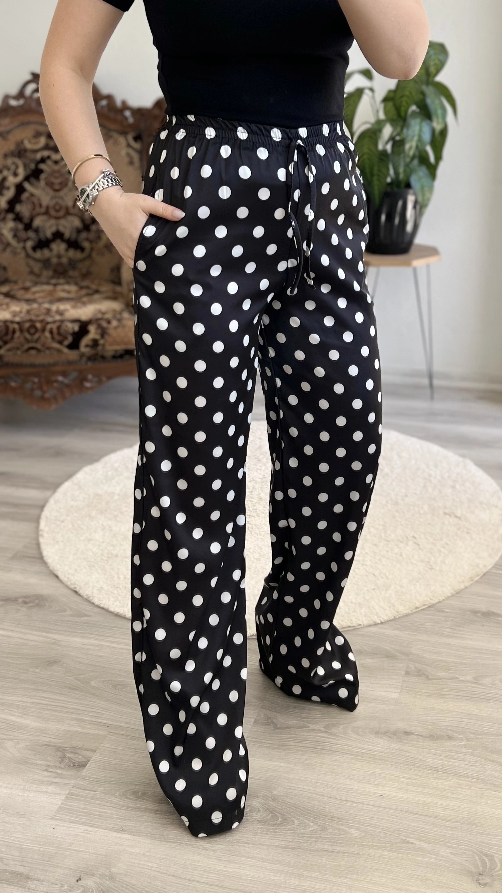 SATEN PUANTİYE DESENLİ BEL LASTİKLİ CEP DETAYLI PANTOLON