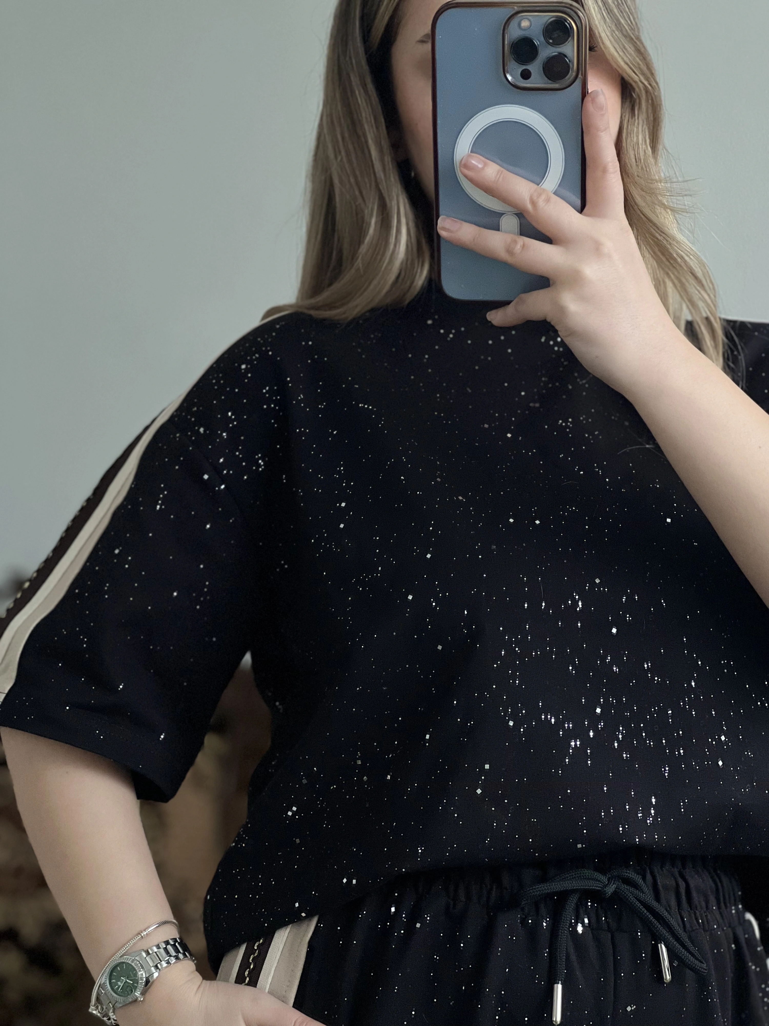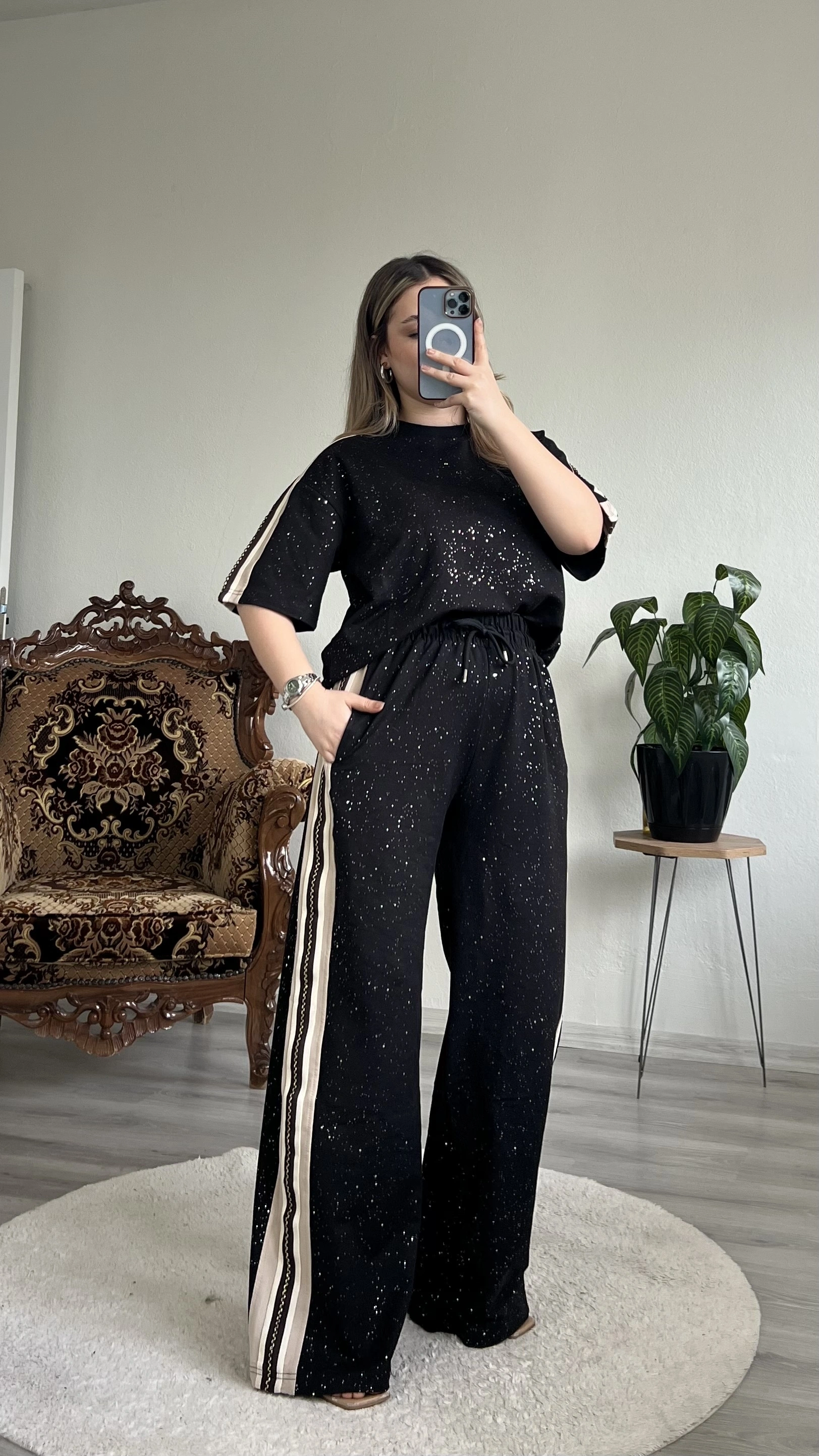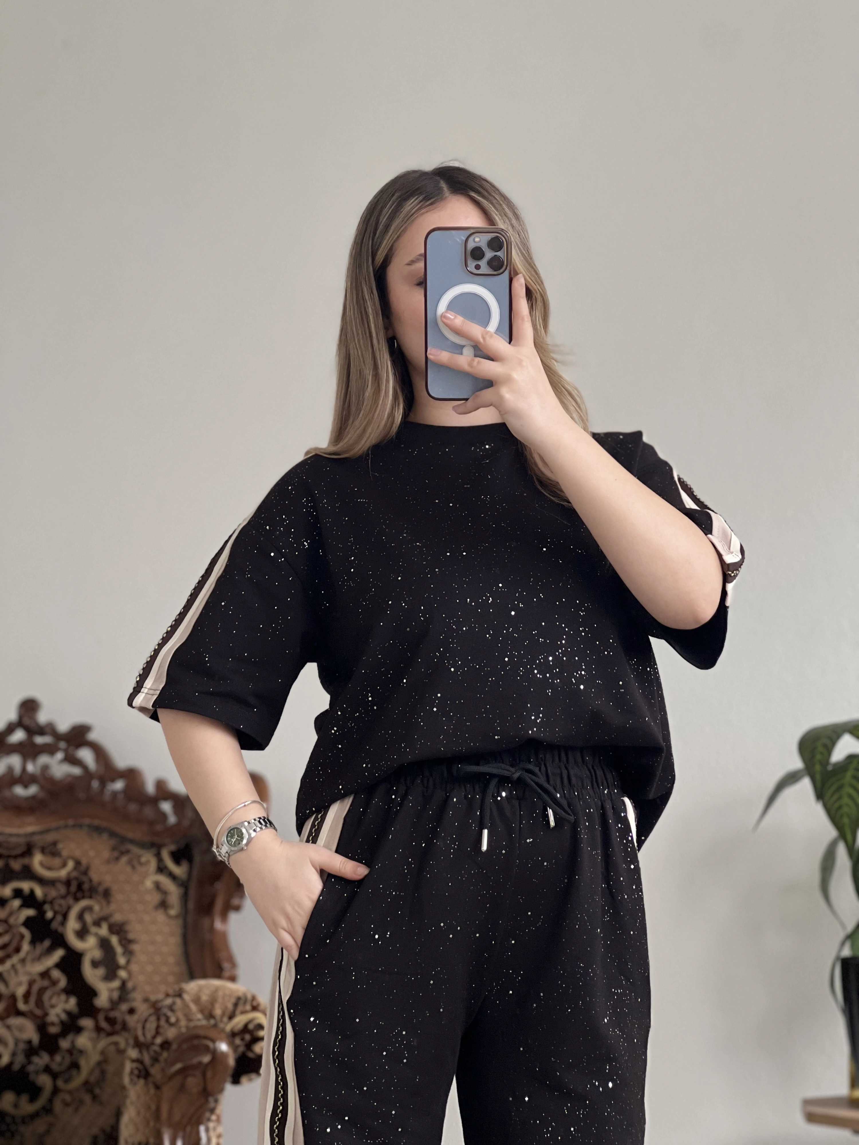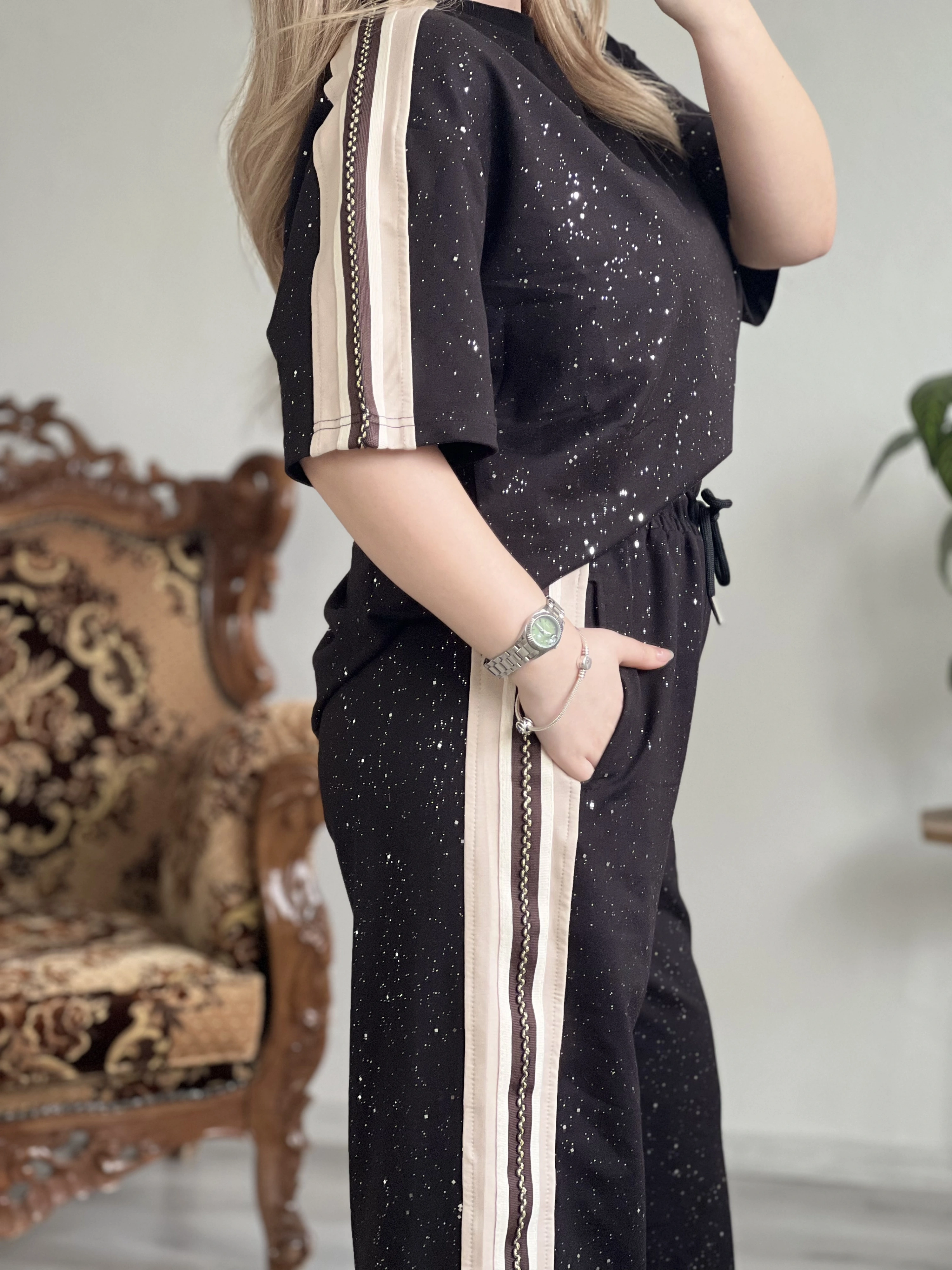 Yumuşak dokulu kumaşı ve modern kesimiyle öne çıkan bu takım, yan şerit detayıyla sportif bir hava katıyor.