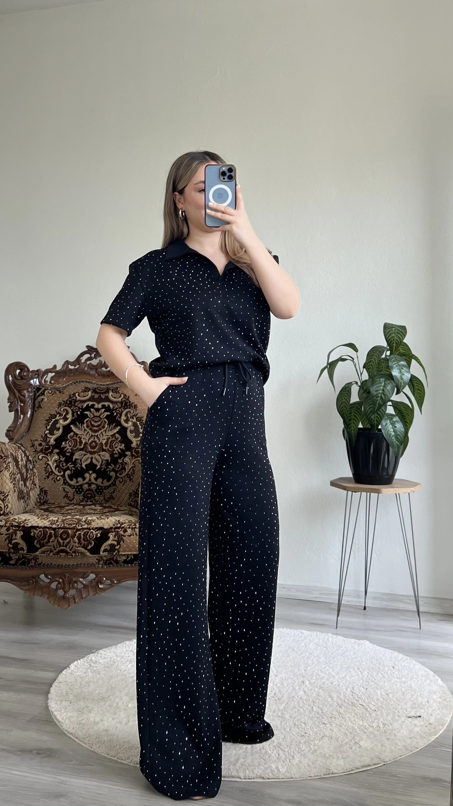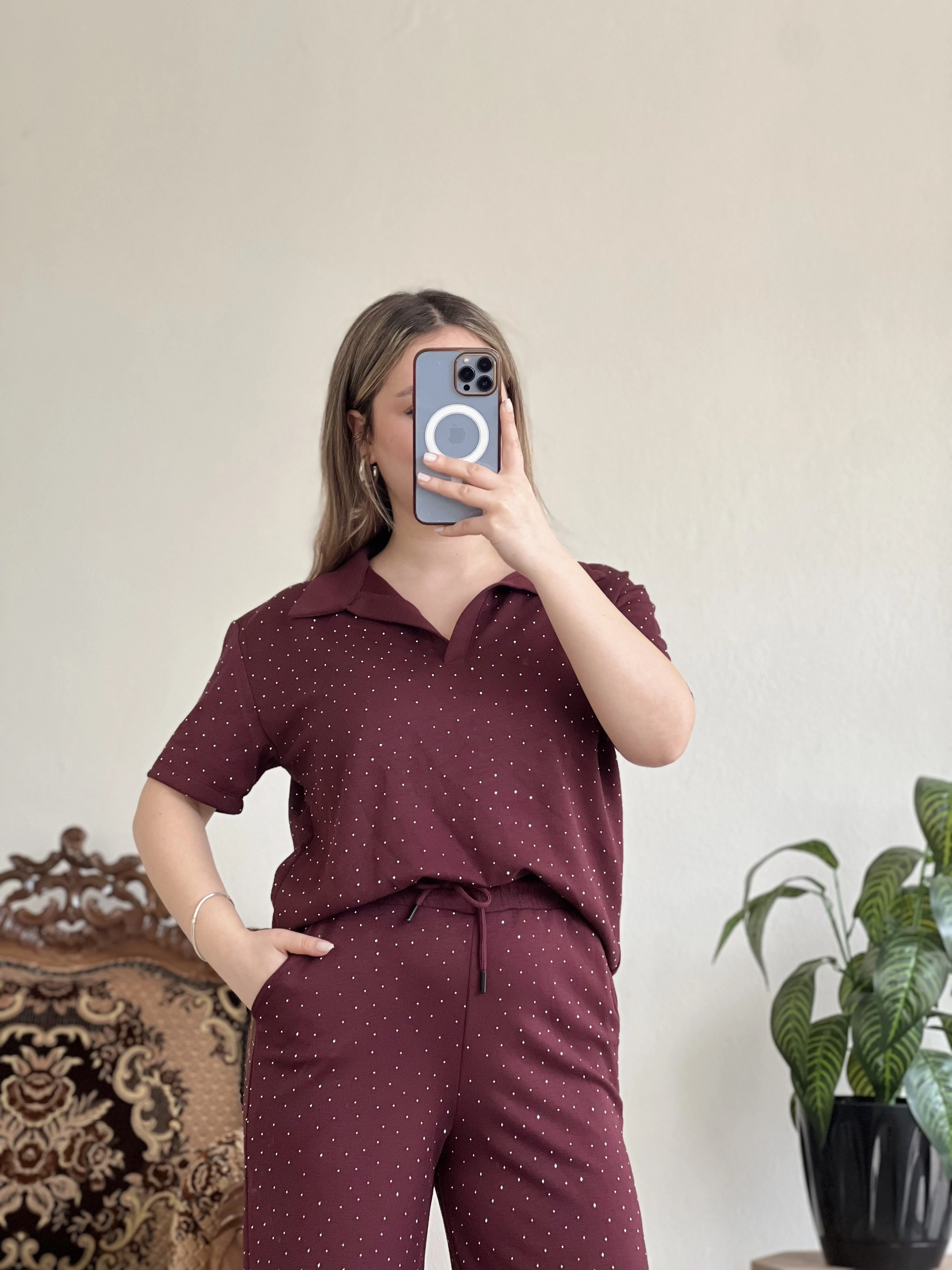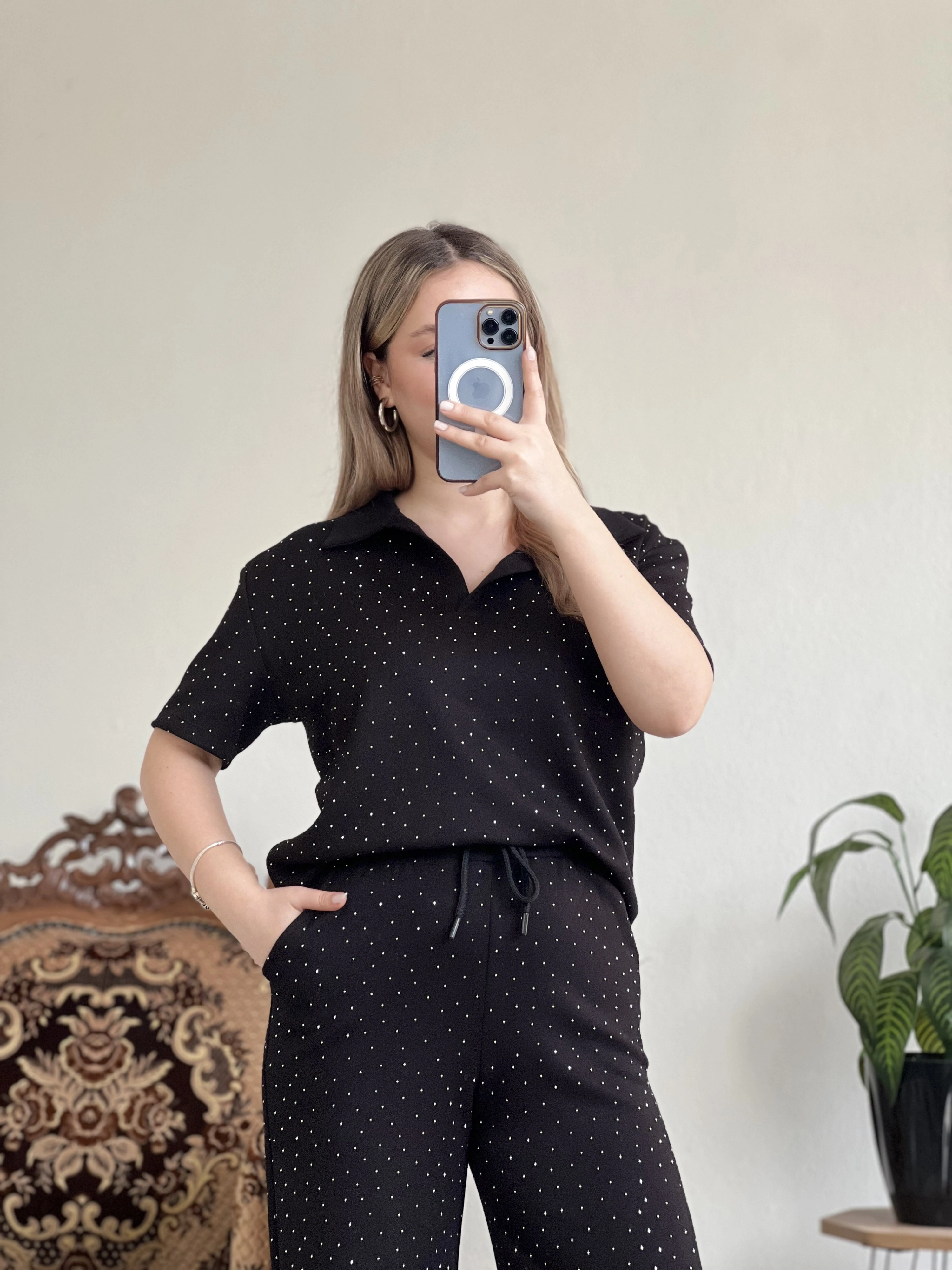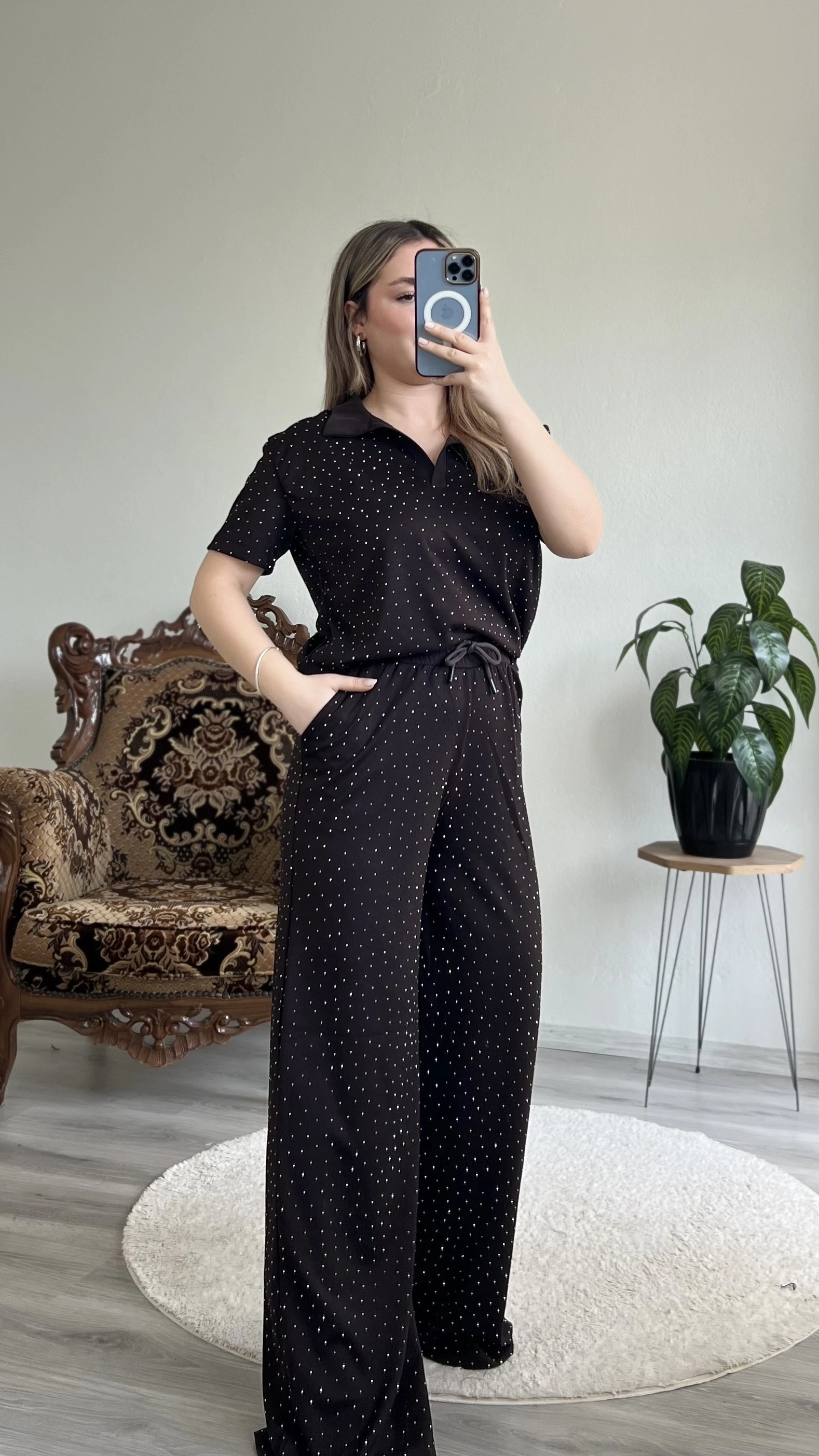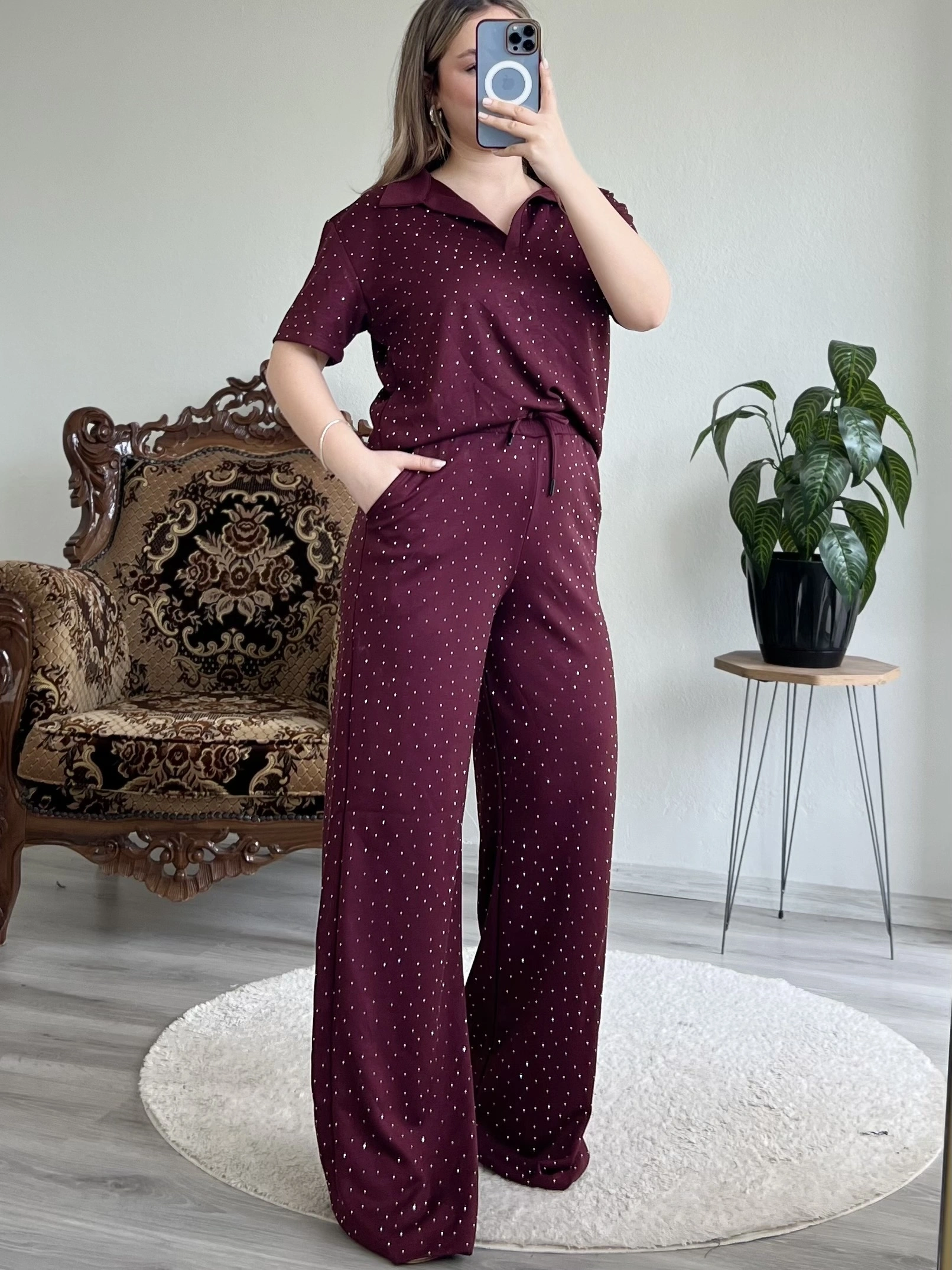 MODAL YUMUŞAK KUMAŞLI TAŞLI POLO YAKA TAKIM GENİŞ KALIP