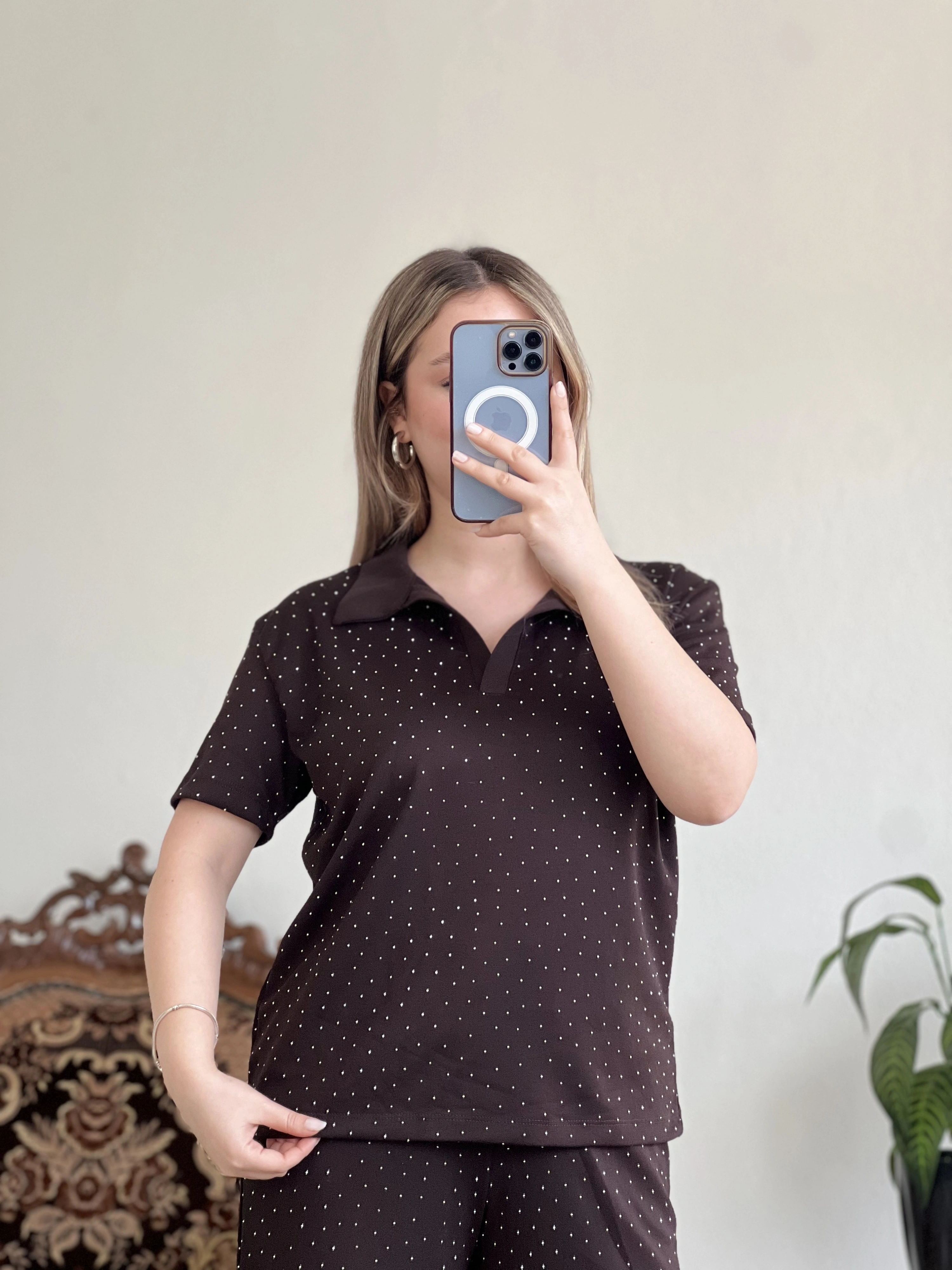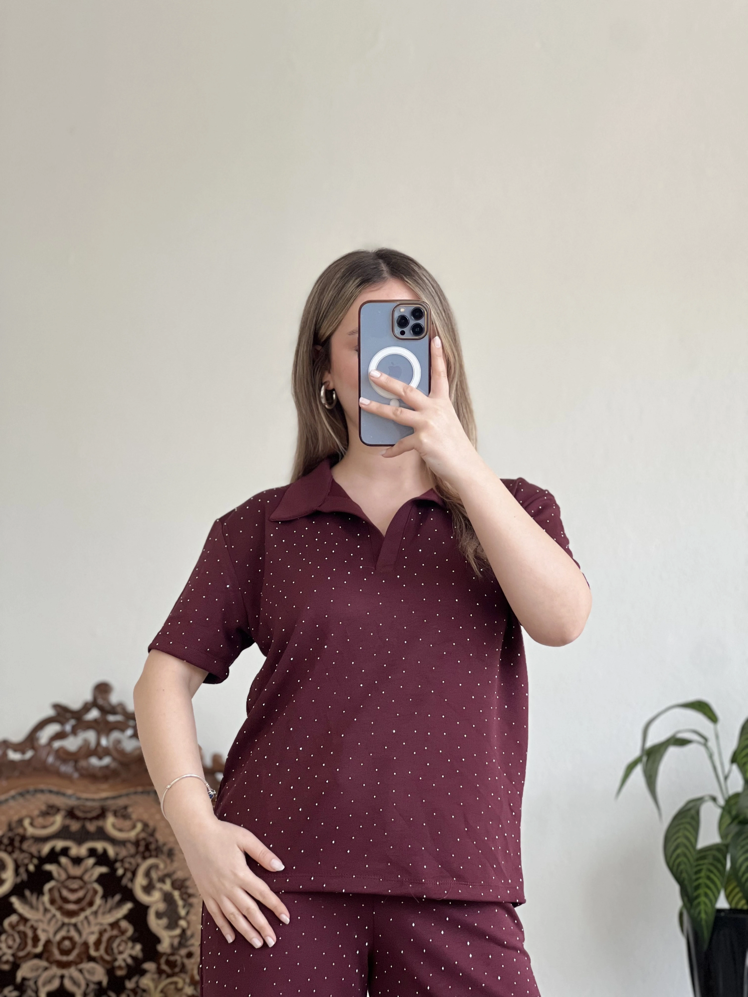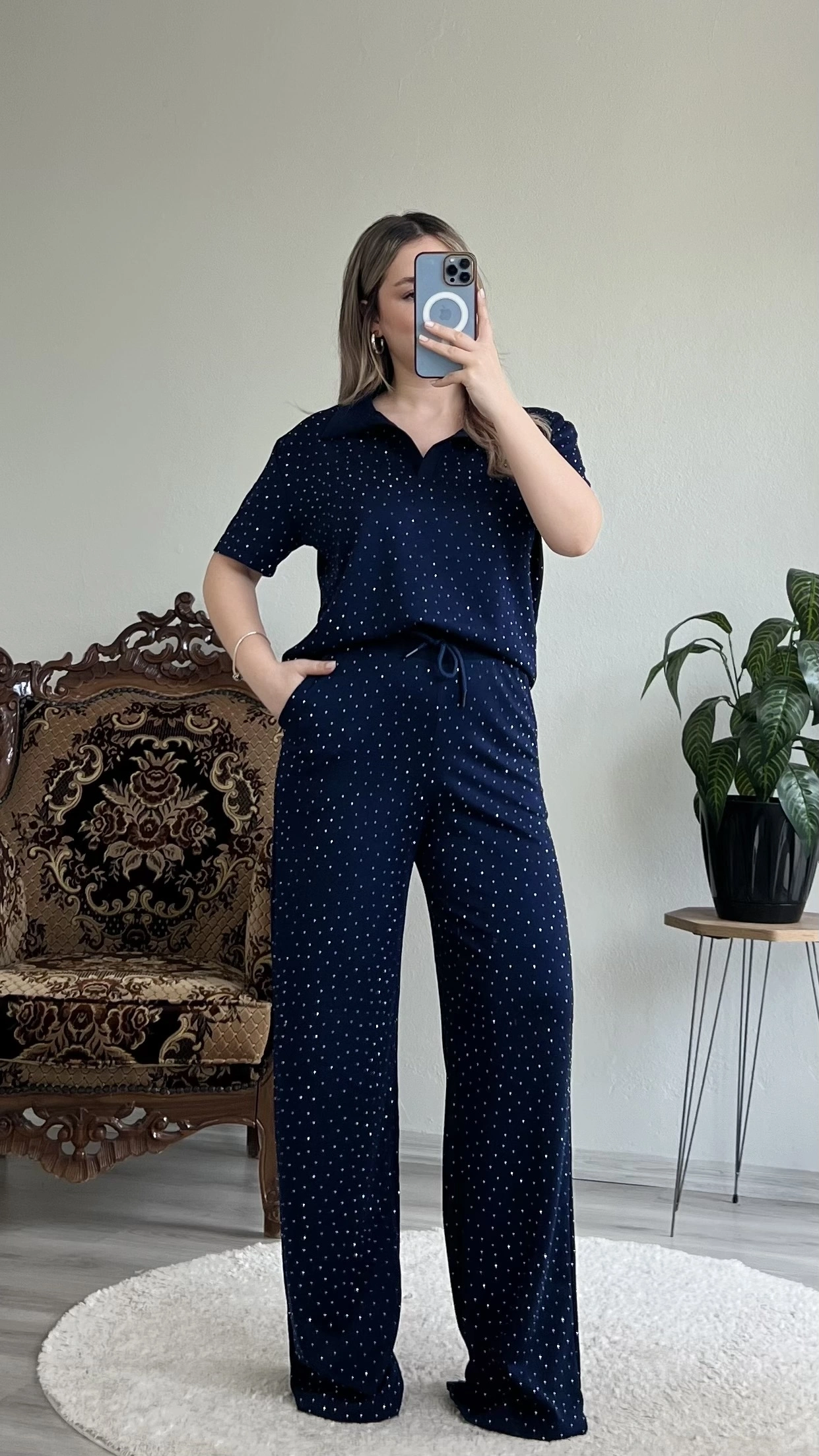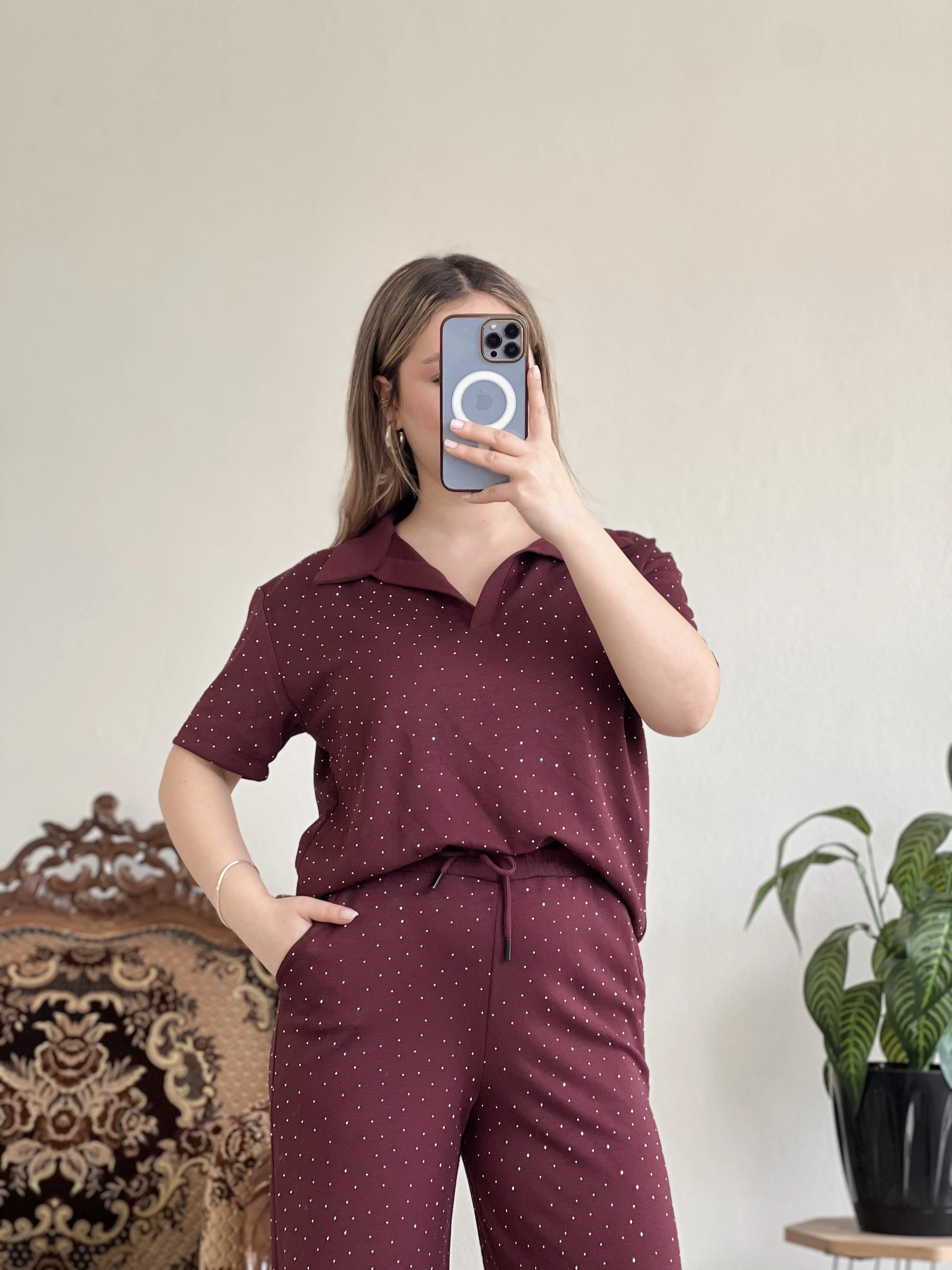 MODAL YUMUŞAK KUMAŞLI TAŞLI POLO YAKA TAKIM GENİŞ KALIP